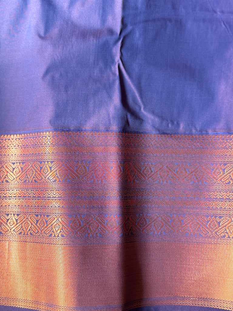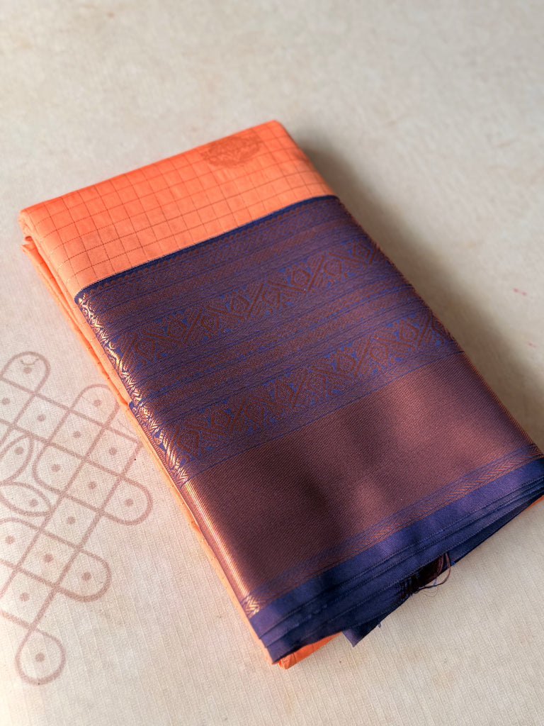 Bring festive charm to your wardrobe with this stunning semi Kanchi silk saree. The body is adorned in a Dark Orange base, decorated with delicate copper zari buttas that add subtle sparkle and elegance. The dark blue zari border is astonishing with the traditional gold zari detailing.