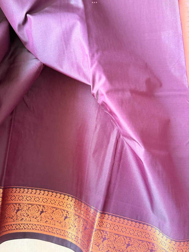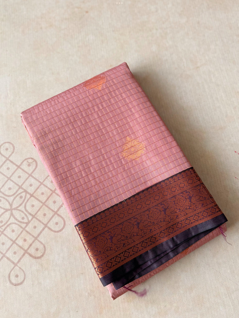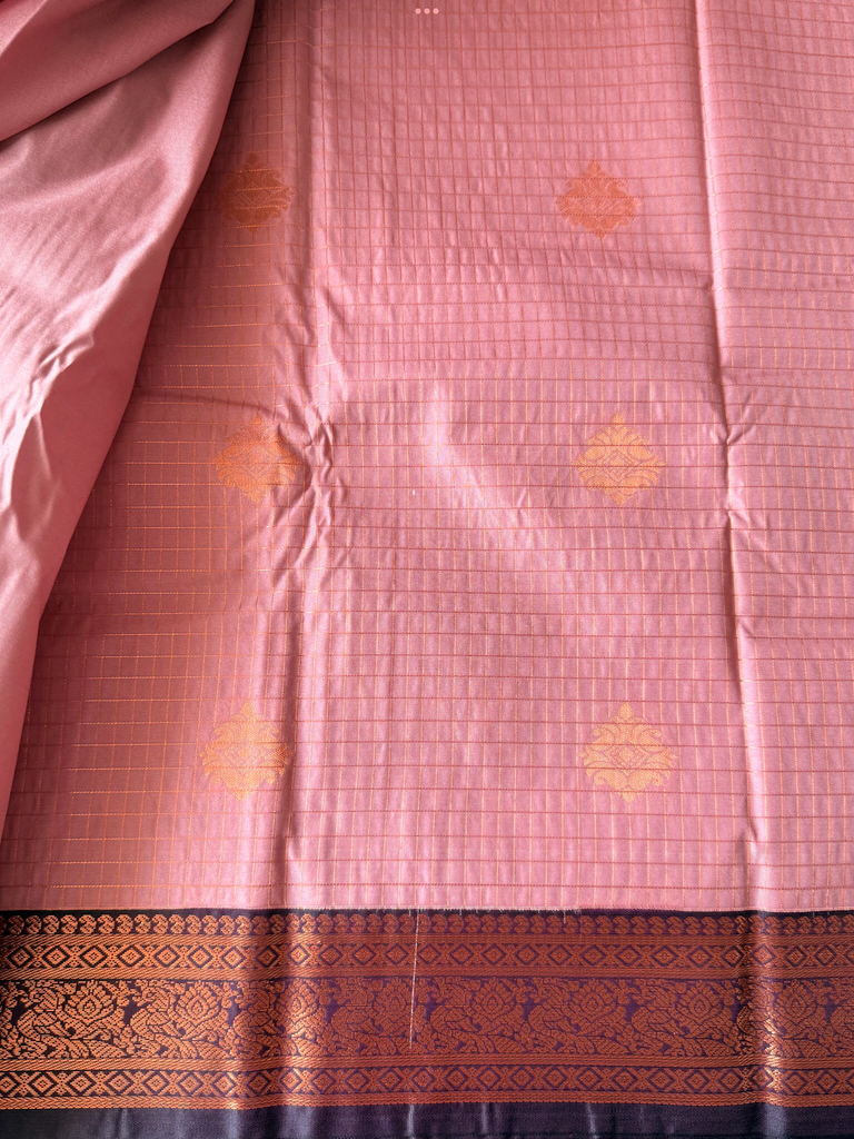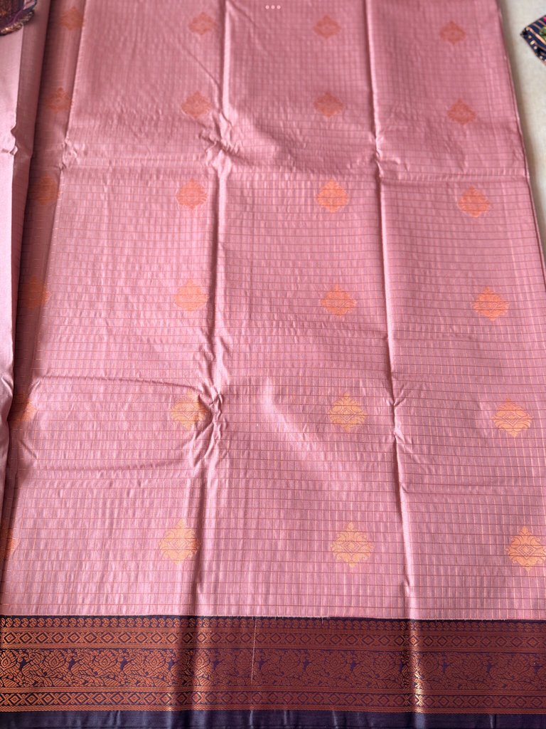 Bring festive charm to your wardrobe with this stunning semi Kanchi silk saree. The body is adorned in a Onion pink base, decorated with delicate gold zari buttas that add subtle sparkle and elegance. The deep purple zari border is astonishing with the traditional gold zari detailing.