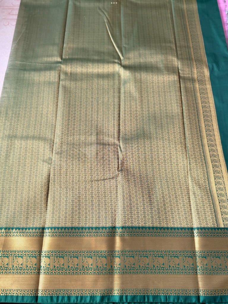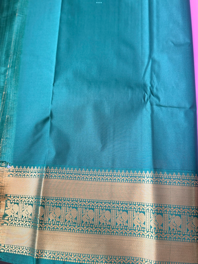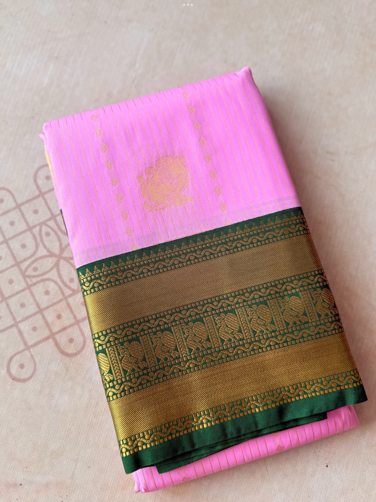 Bring festive charm to your wardrobe with this stunning semi Kanchi silk saree. The body is adorned in a lilac base, decorated with delicate zari buttas that add subtle sparkle and elegance. The green zari border is astonishing with the traditional gold zari detailing.