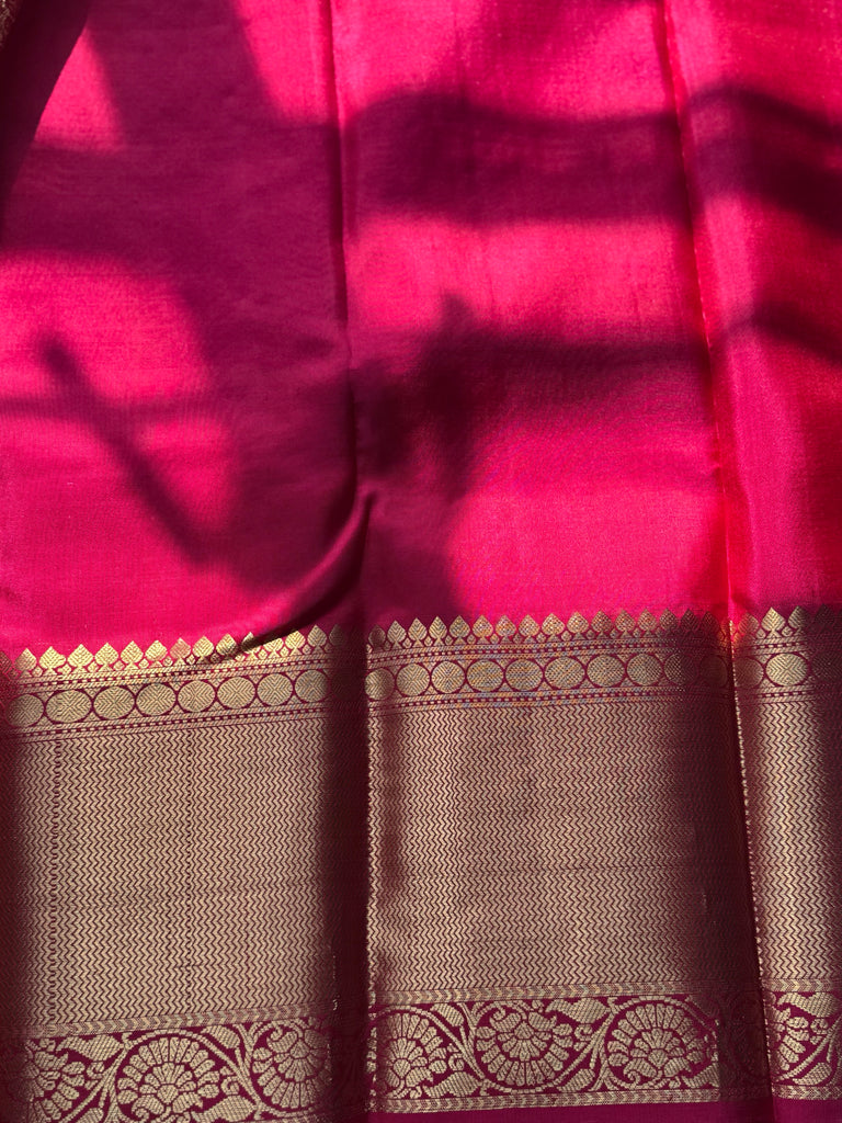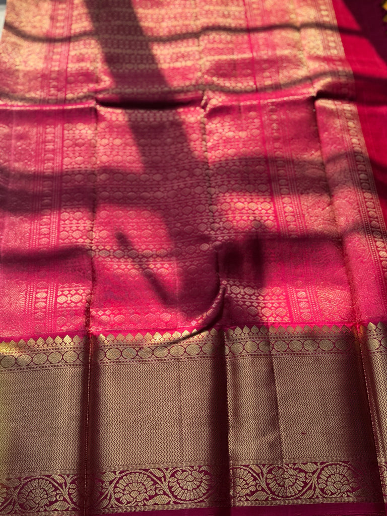 Elevate your traditional look with our exquisite Kanjivaram Pure Silk Zari Saree. Adorned in a ancient style parrot green shade with a contrasting bold pink pallu, this saree exudes elegance. The intricate zari designs and golden border add to its exclusivity. Made from pure kanjivaram bridal silk, it is truly a work of art.