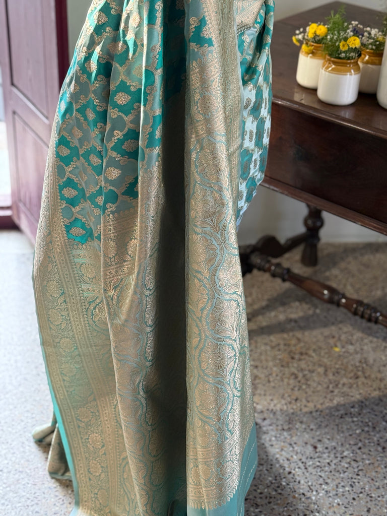 A true work of art, this ice blue pure handwoven Banarasi Katan silk saree is a timeless expression of heritage and refined elegance. The body is beautifully adorned with an all-over Rangkat pattern, intricately woven in fine zari threads that lend a subtle yet luxurious sheen.