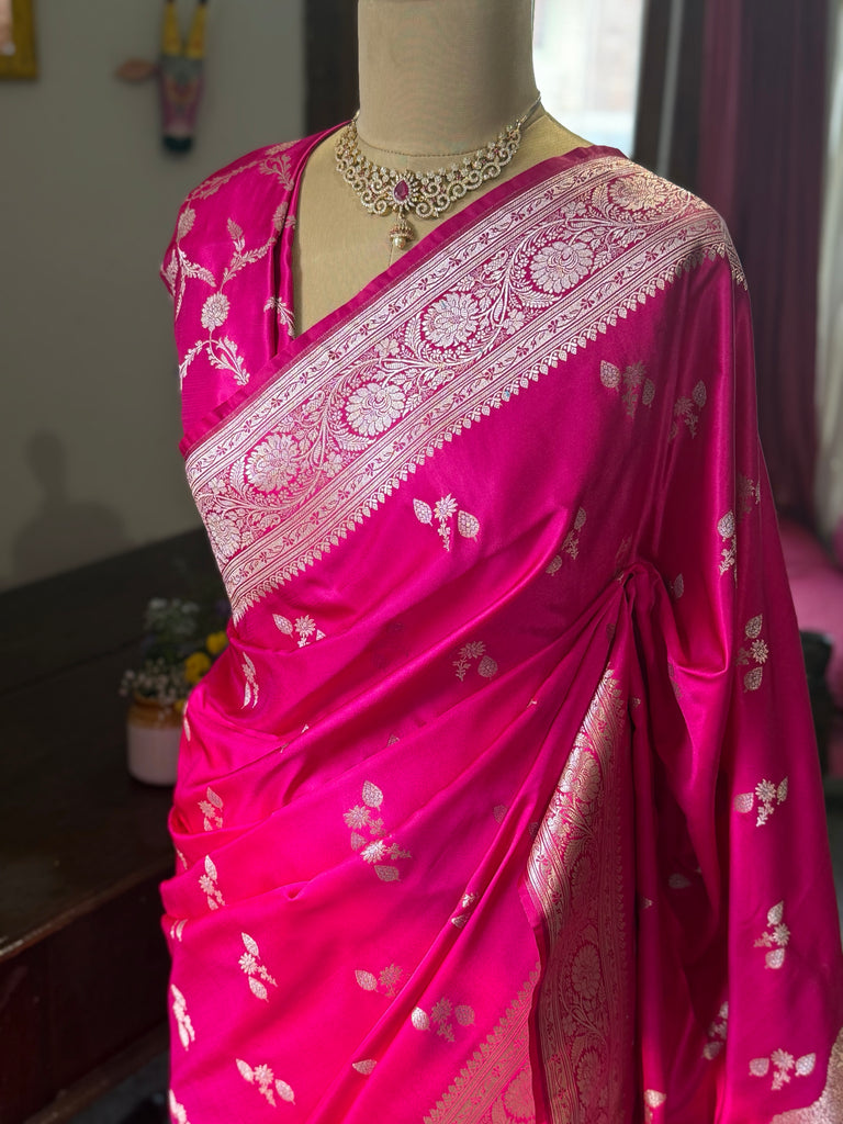 A striking expression of timeless elegance, this pure handwoven Banarasi Katan silk saree is crafted to celebrate heritage with a bold yet refined presence. Rendered in a vibrant hot pink hue, the saree radiates festive charm while maintaining the sophistication of classic Banarasi craftsmanship.
