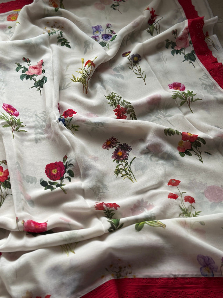 Embrace timeless elegance with this exquisite White Floral Georgette Saree, beautifully adorned with delicate multicolour floral prints that exude a soft, feminine charm. The lightweight georgette fabric drapes gracefully, making it perfect for both daytime elegance and evening sophistication.