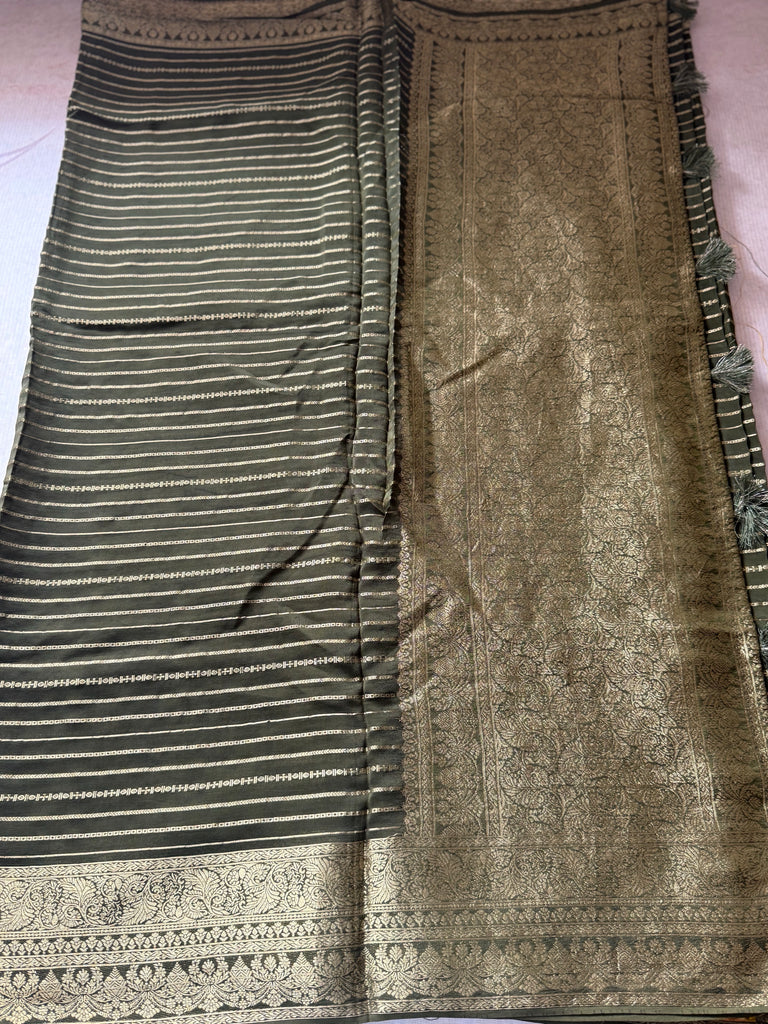 This stunning green Antique Banarasi saree, crafted from rich dupion silk, features exquisite woven intricately with fine zari lines across the entire body. The luxurious weave showcases the beauty of traditional Banarasi craftsmanship, giving the saree a regal and elegant appeal.