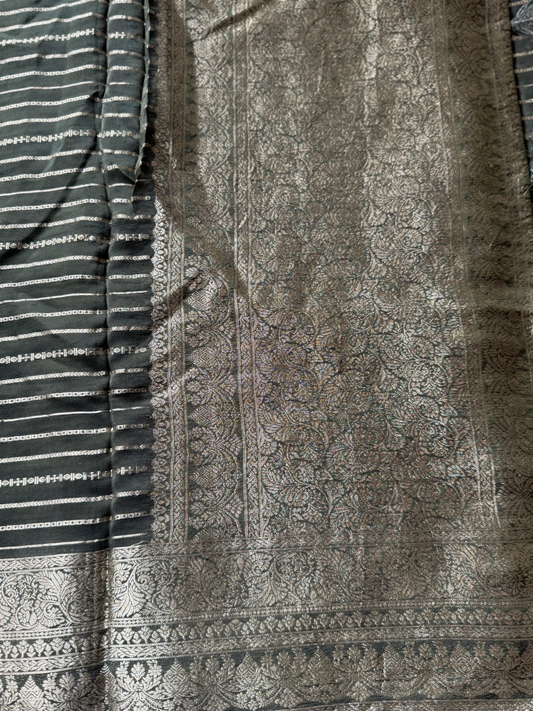 The border is adorned with classic zari motifs, adding depth and heritage charm, while the pallu carries traditional zari detailing with beautifully intricate patterns. Completing the ensemble, the matching blouse features delicate floral buttas throughout, perfectly enhancing the elegance of the saree. A timeless and graceful piece, ideal for those who appreciate true artisanal beauty.