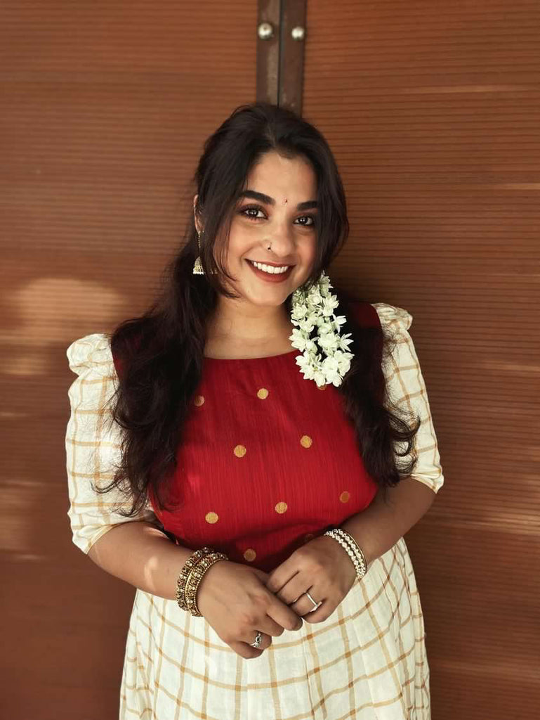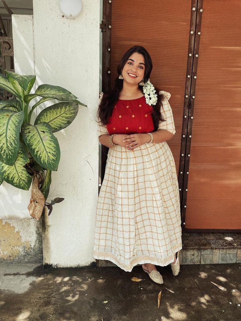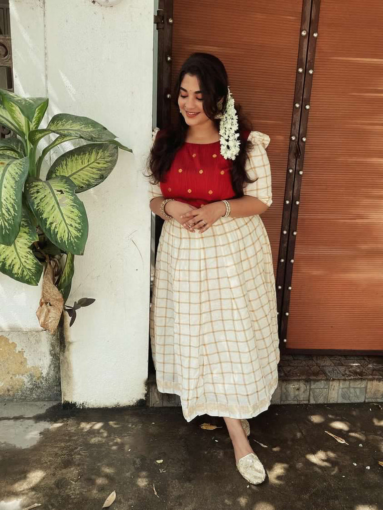 Beautiful Pure cotton gold zari detailed dress with red gold buttas in the yoke , perfect for Onam celebration.