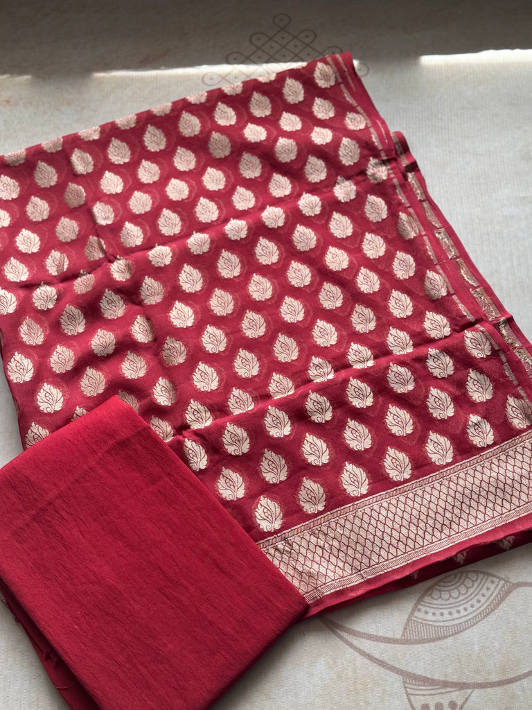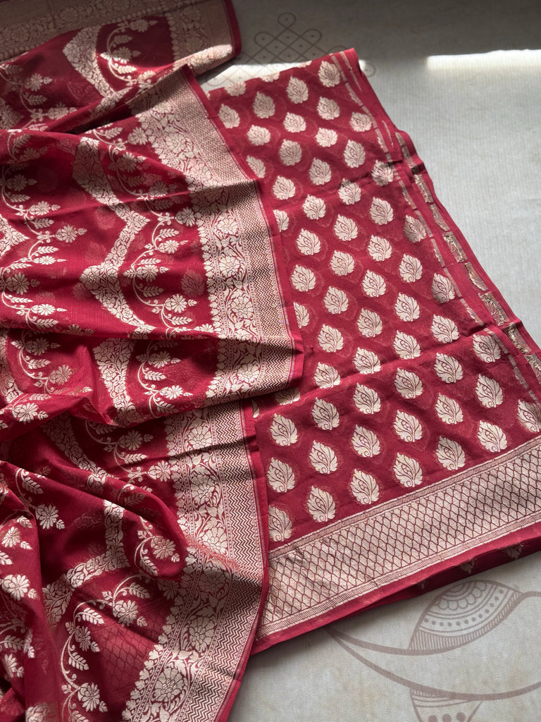 Paired with a plain silk pant for a refined contrast, the ensemble is elevated by a Georgette dupatta adorned with zari work throughout. The border of the dupatta is beautifully finished with a jaal-patterned zari design, adding depth and richness. Perfect for festive occasions or cultural celebrations, this set is a timeless expression of grace, tradition, and sophistication.