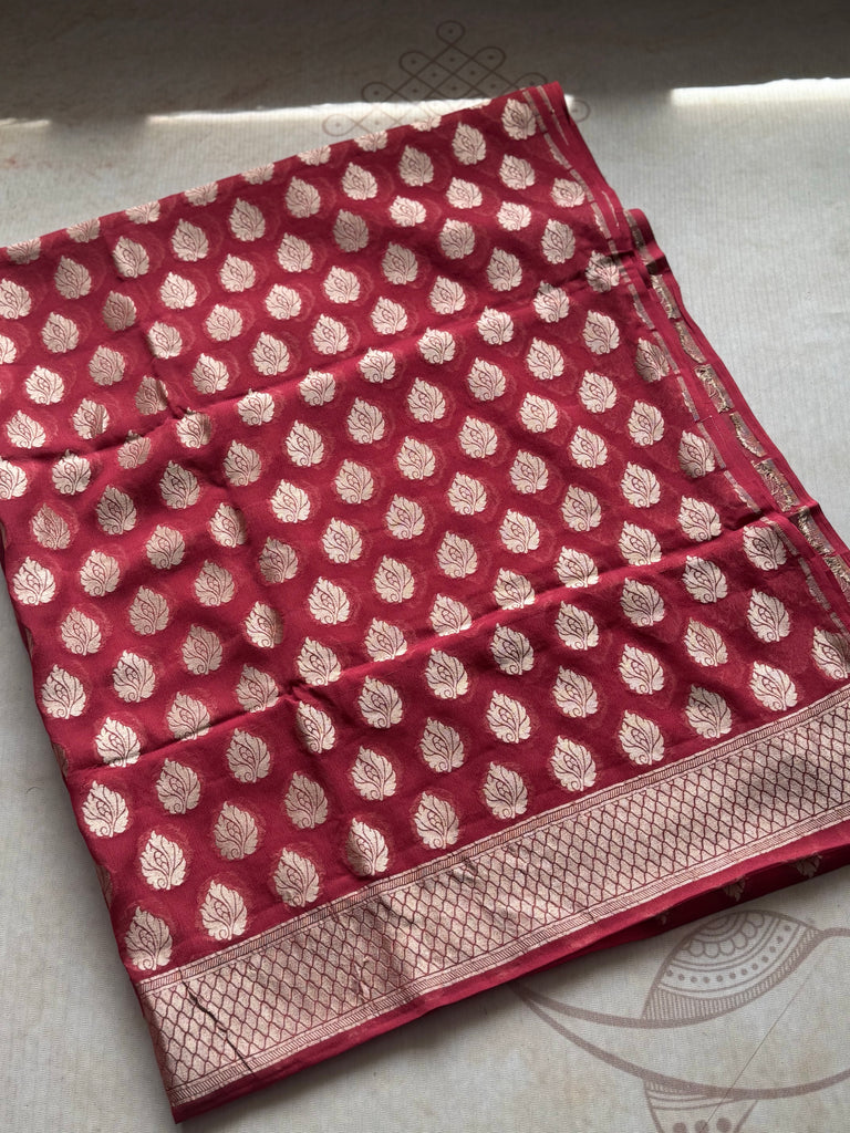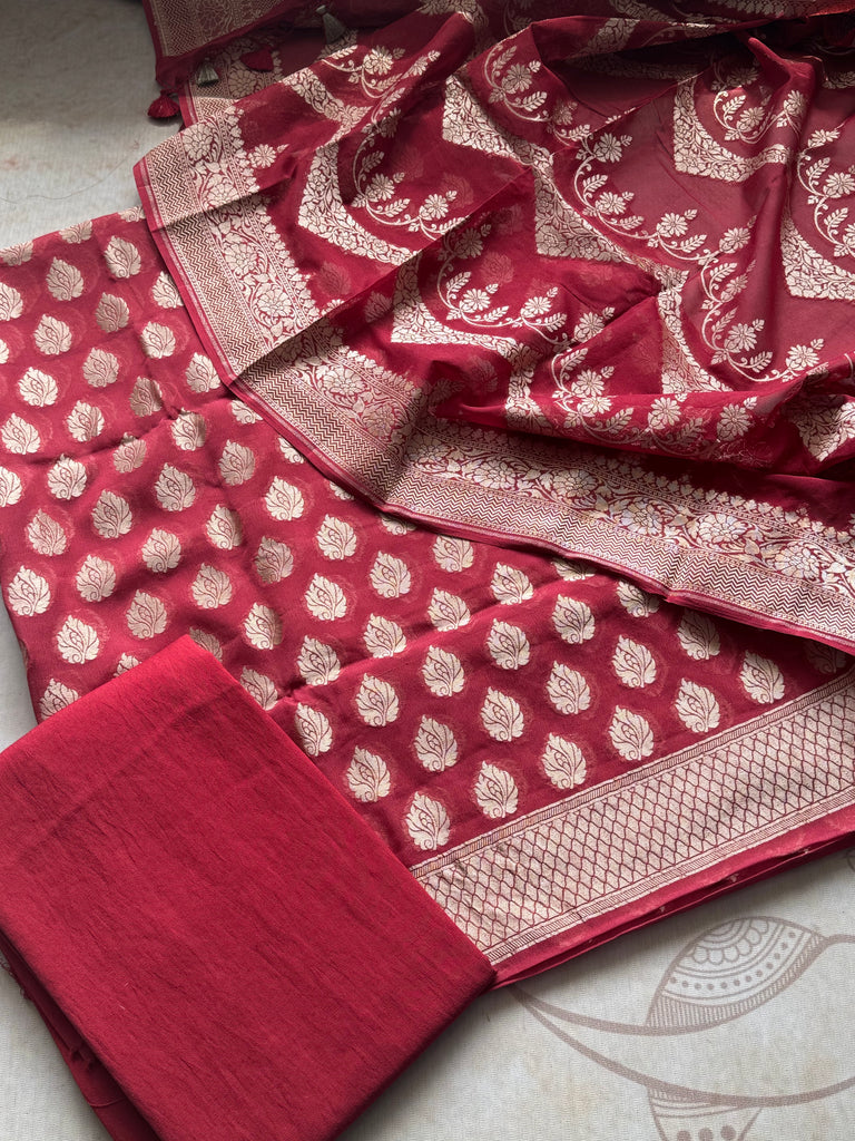 Radiating traditional charm with a regal touch, this Sindhoori Red Banarasi Georgette Bandhej Salwar Suit Set is a perfect blend of heritage and elegance. The kurta features intricate Bandhej buttas scattered gracefully across the body, complemented by zari-detailed borders that add a subtle shimmer.