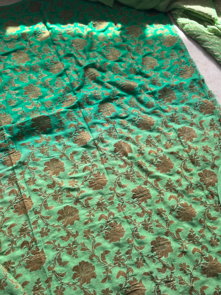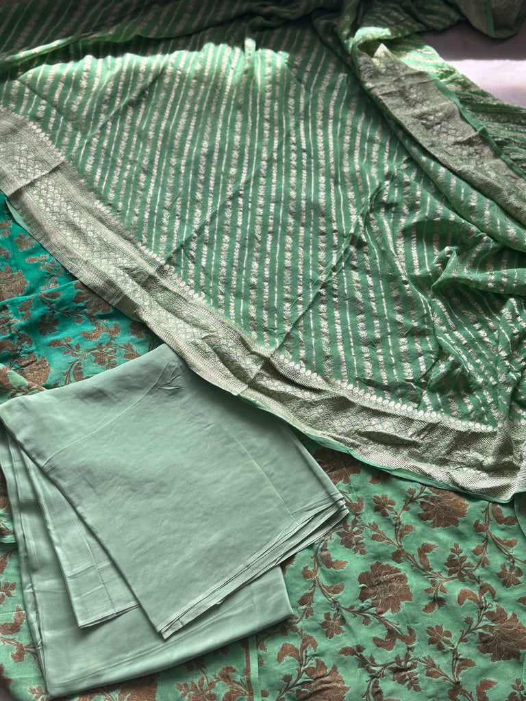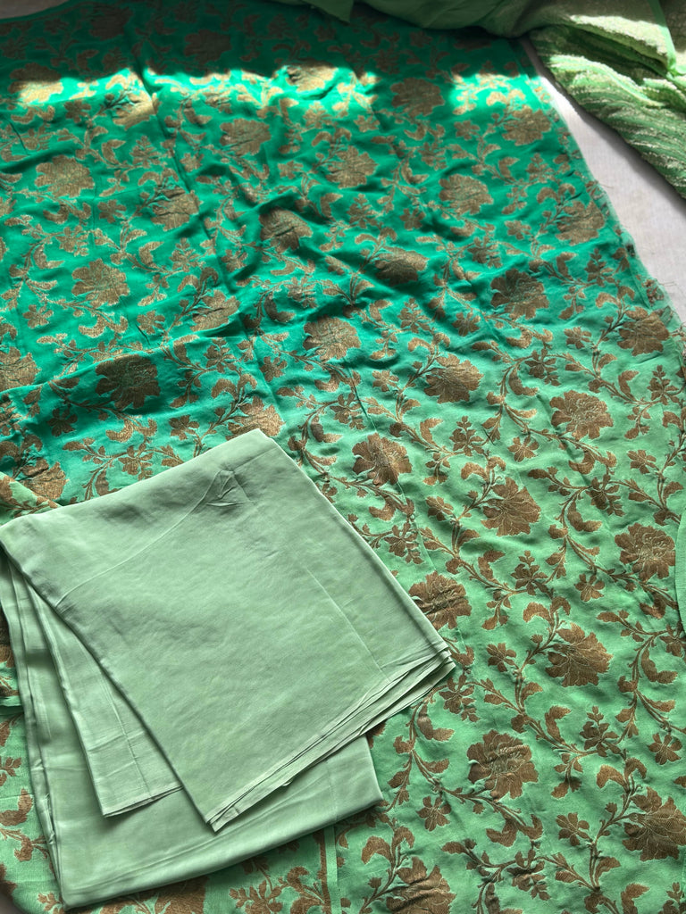 A beautiful blend of color and craftsmanship, this Banarasi Georgette Bandhej Suit Set features an ombre-inspired design, transitioning gracefully from a soft pistachio hue on the upper kurta to a serene aqua blue at the hem. The kurta is adorned with an intricate jaal pattern in fine zari detailing, lending it a subtle shimmer and timeless appeal.