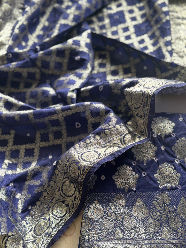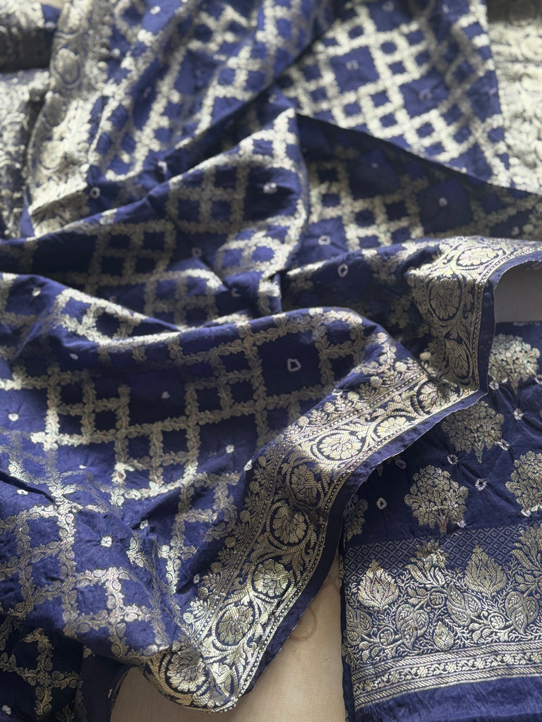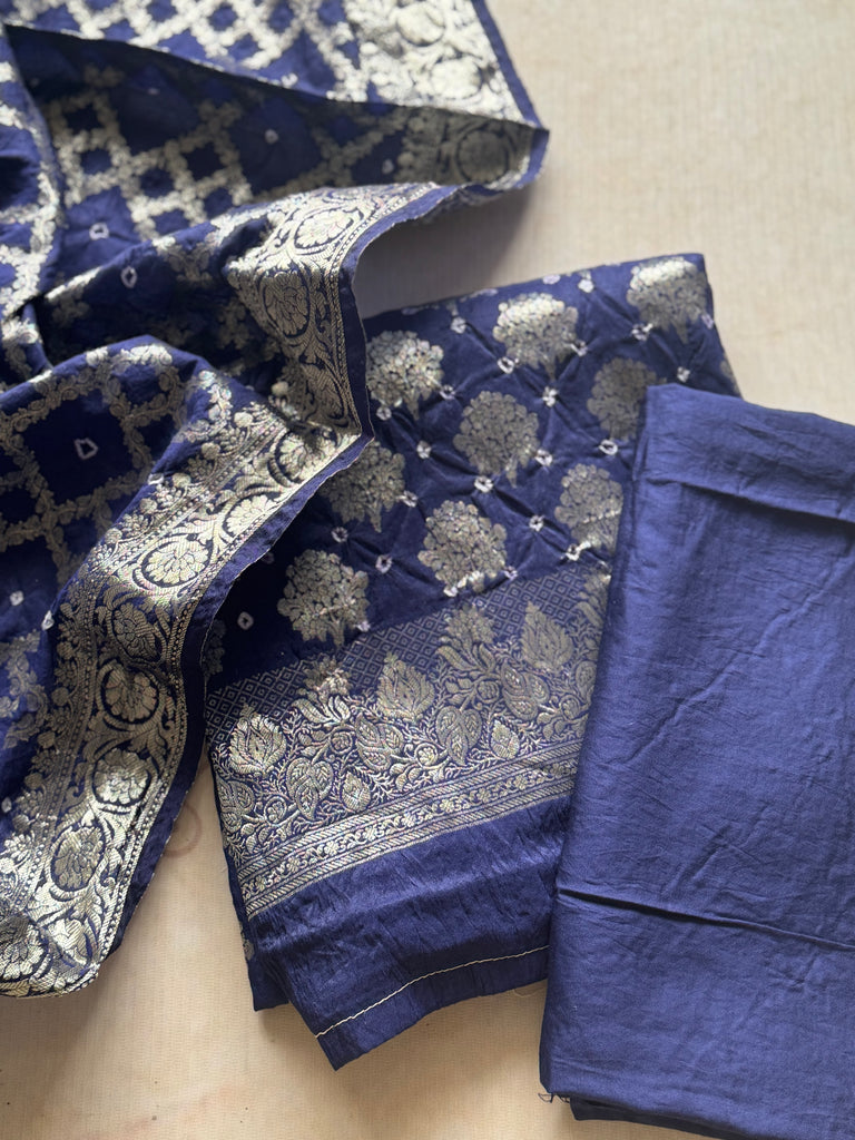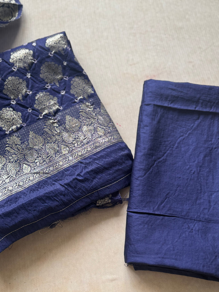 Elevate your ethnic wardrobe with this elegant Banarasi Unstitched Salwar Suit Set. The beautiful blue coloured top fabric is crafted from rich Banarasi material, adorned with intricate zari motifs for a timeless look. It comes with plain satin bottom fabric for a smooth, luxurious drape, and a dupatta featuring delicate zari work that add a soft, graceful finish.