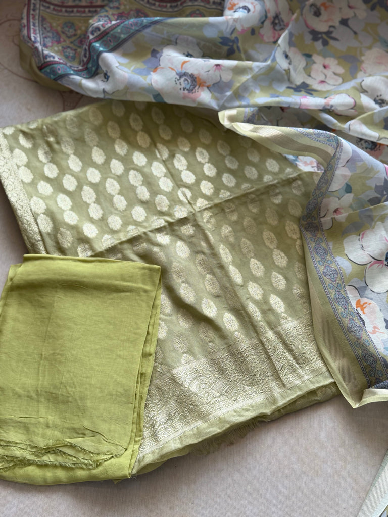 Elevate your ethnic wardrobe with this elegant Banarasi Unstitched Salwar Suit Set. The Pistachio hued top fabric is crafted from rich Banarasi material, adorned with intricate zari motifs for a timeless look. It comes with plain satin bottom fabric for a smooth, luxurious drape, and a Chanderi dupatta featuring delicate floral patterns that add a soft, graceful finish.