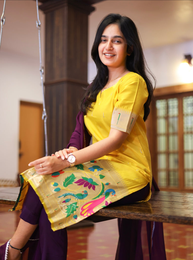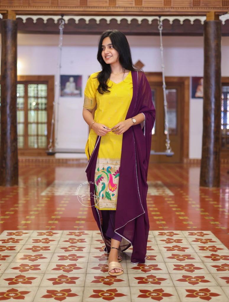This Paithani set features a beautiful yellow kurta paired with purple dupatta and pants for a stunning contrast look. Made with high-quality materials, this set offers both style and comfort to elevate your wardrobe. Perfect for any occasion, this set is a must-have for those looking for a modern twist on traditional Indian fashion.