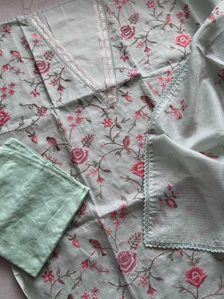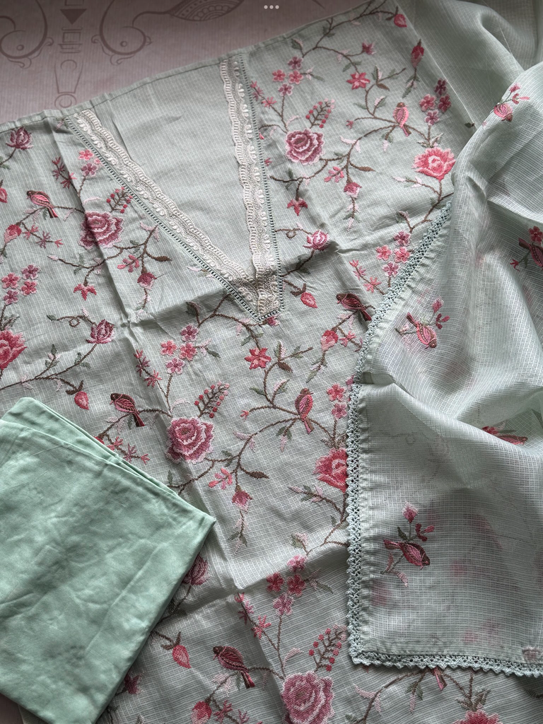 This graceful salwar suit set is crafted in a soothing pastel base with intricate floral embroidery in pink and rose tones. The kurta features delicate threadwork with blooming floral motifs and dainty bird patterns, accentuated by lace detailing along the neckline for a refined touch. Paired with a plain matching salwar and a lightweight dupatta adorned with fine lace edging and scattered embroidered motifs, this set beautifully blends simplicity with elegance. Perfect for casual gatherings, festive wear, or daytime occasions, it offers comfort with a touch of sophistication.