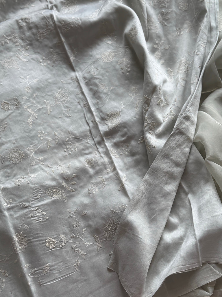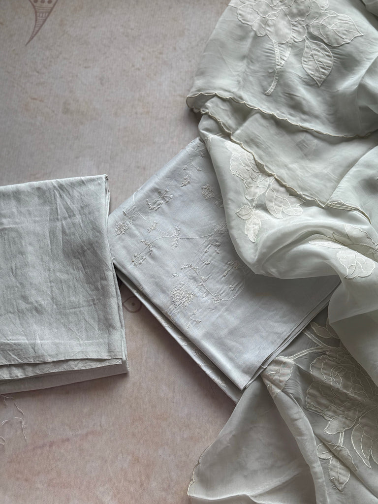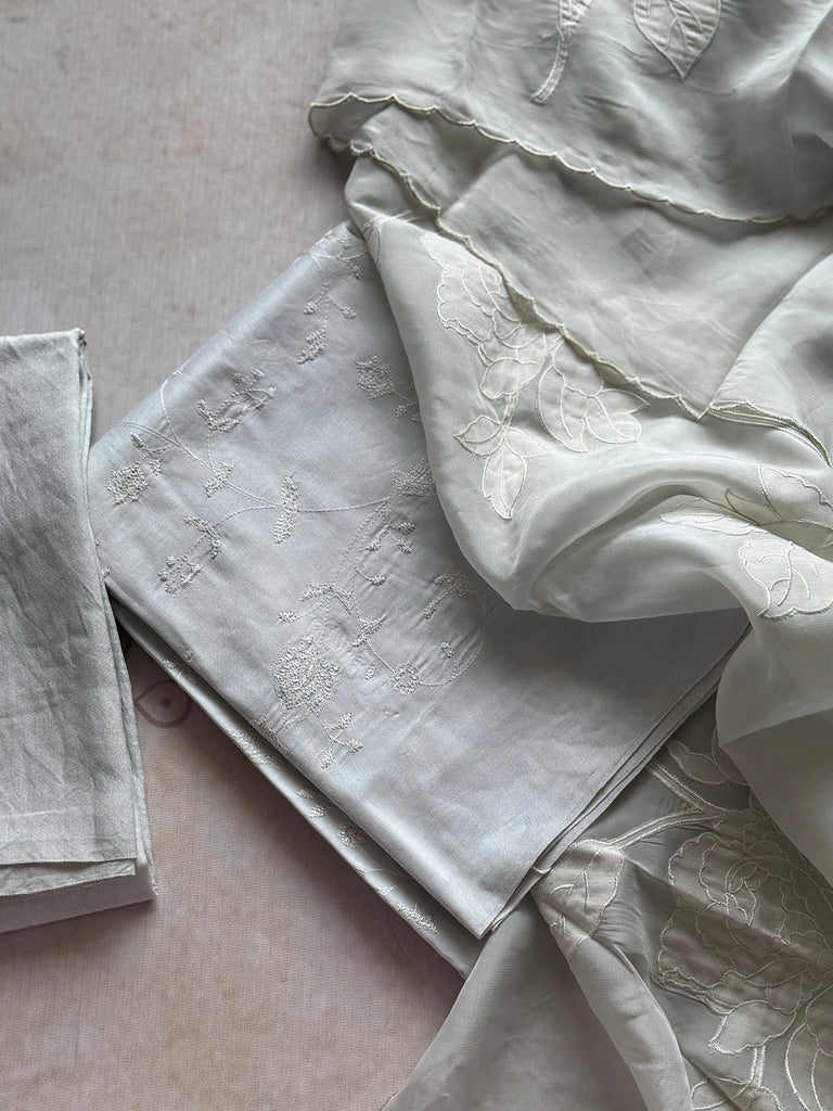 Add a touch of elegance to your ethnic collection with this beautiful Greenish Grey unstitched salwar suit material. The top is made of premium Chanderi cotton and features intricate embroidery work that enhances its sophisticated appeal. It is paired with a plain Chanderi bottom fabric, offering comfort and a graceful look. Completing the ensemble is a stunning organza dupatta with an elegant embossed design, adding a soft, luxurious flair. Perfect for festive occasions, casual outings, or special gatherings.