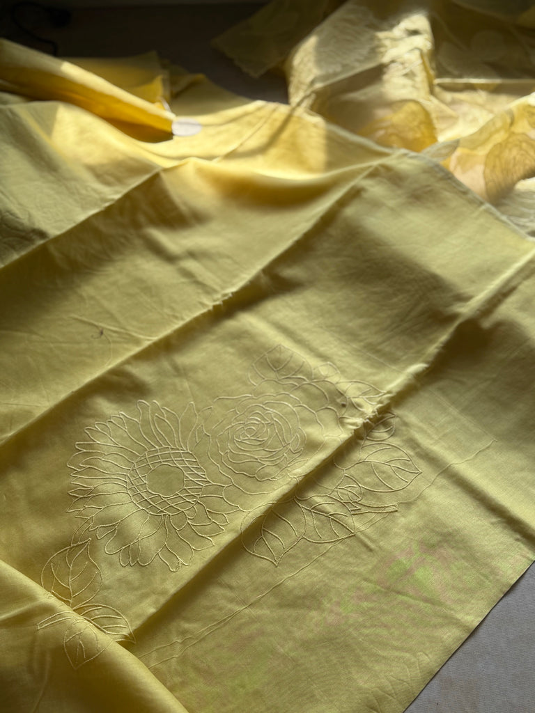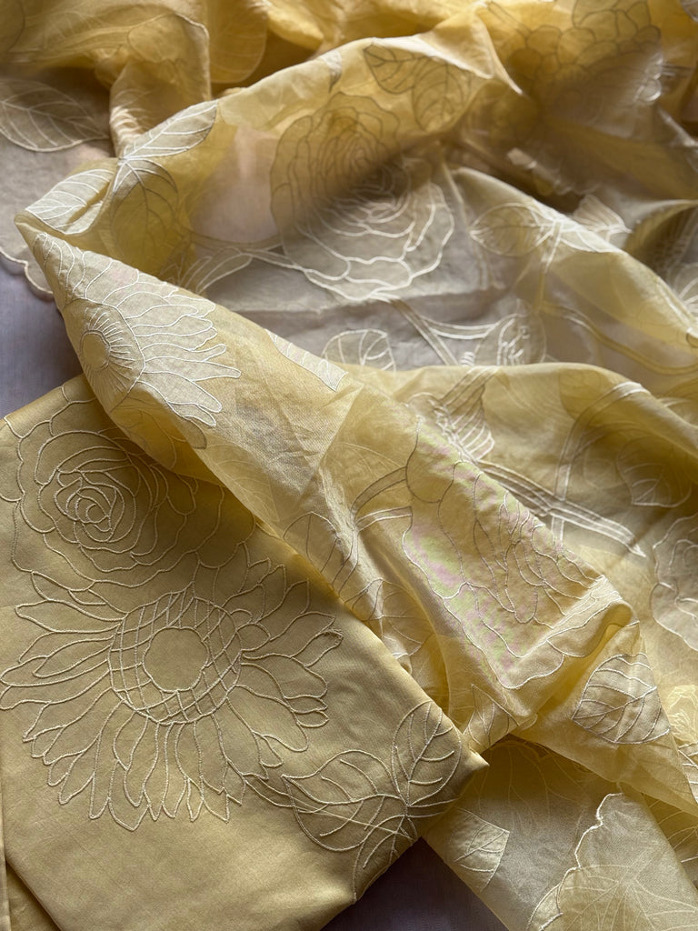 Add a touch of elegance to your ethnic collection with this beautiful Lemon Yellow unstitched salwar suit material. The top is made of premium Chanderi cotton and features intricate embroidery work that enhances its sophisticated appeal. It is paired with a plain Chanderi bottom fabric, offering comfort and a graceful look. Completing the ensemble is a stunning organza dupatta with an elegant embossed design, adding a soft, luxurious flair. Perfect for festive occasions, casual outings, or special gatherings.