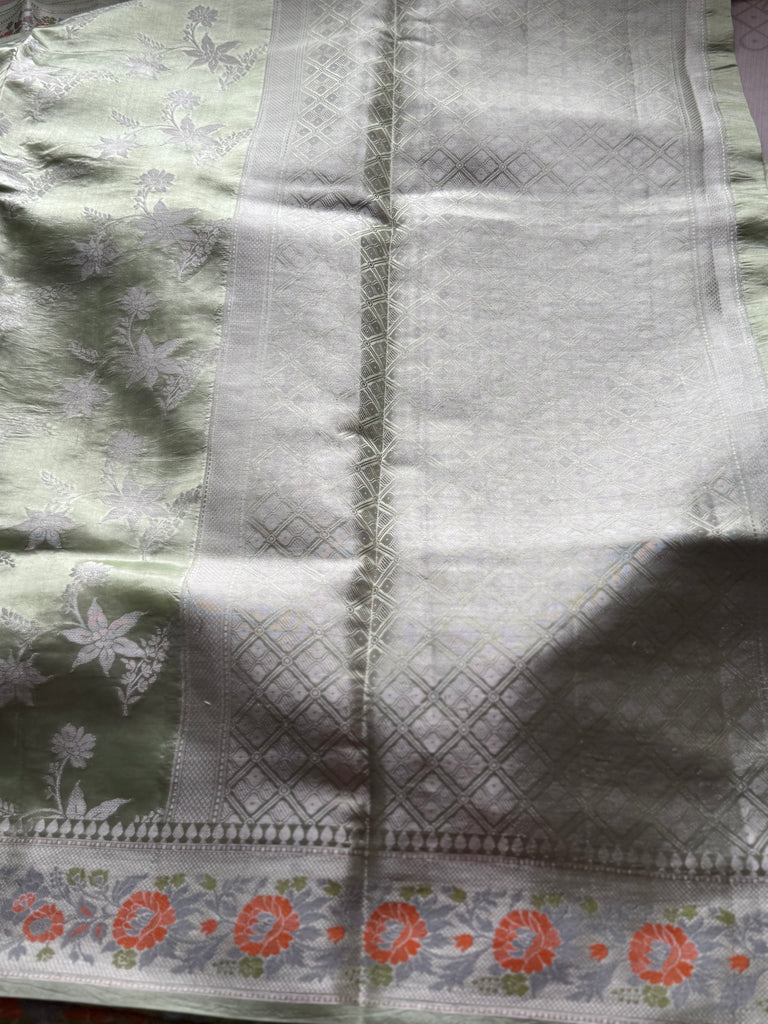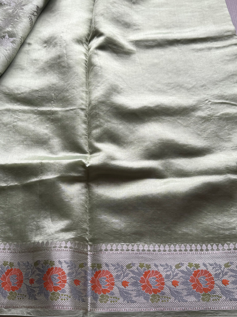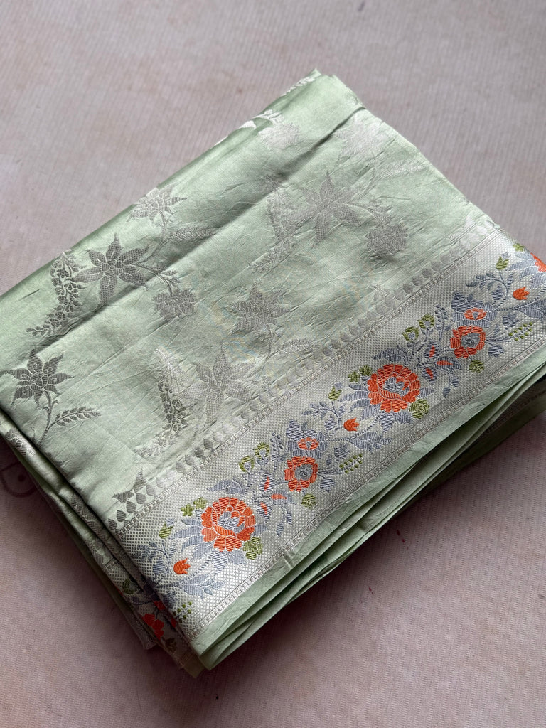 Its border is adorned with intricate floral motifs in vibrant orange and fresh green, lending a delightful contrast against the subtle base. The pallu is richly adorned with zari weaves.The lightweight raw mango silk fabric drapes beautifully, making it both comfortable and graceful for long wear.