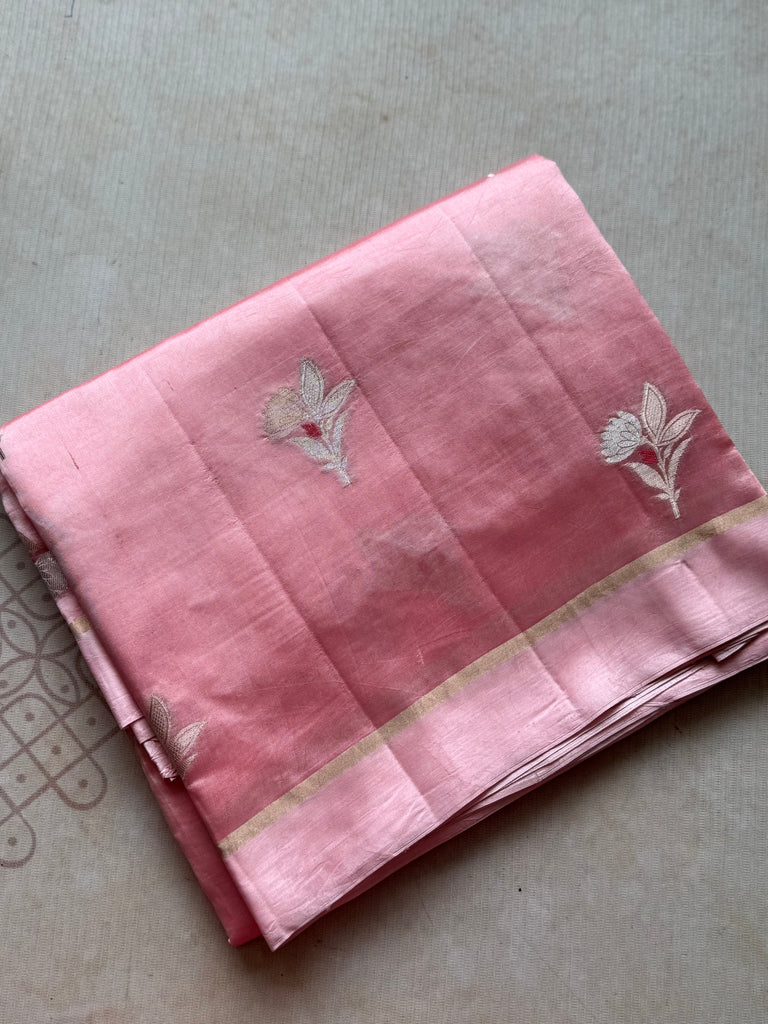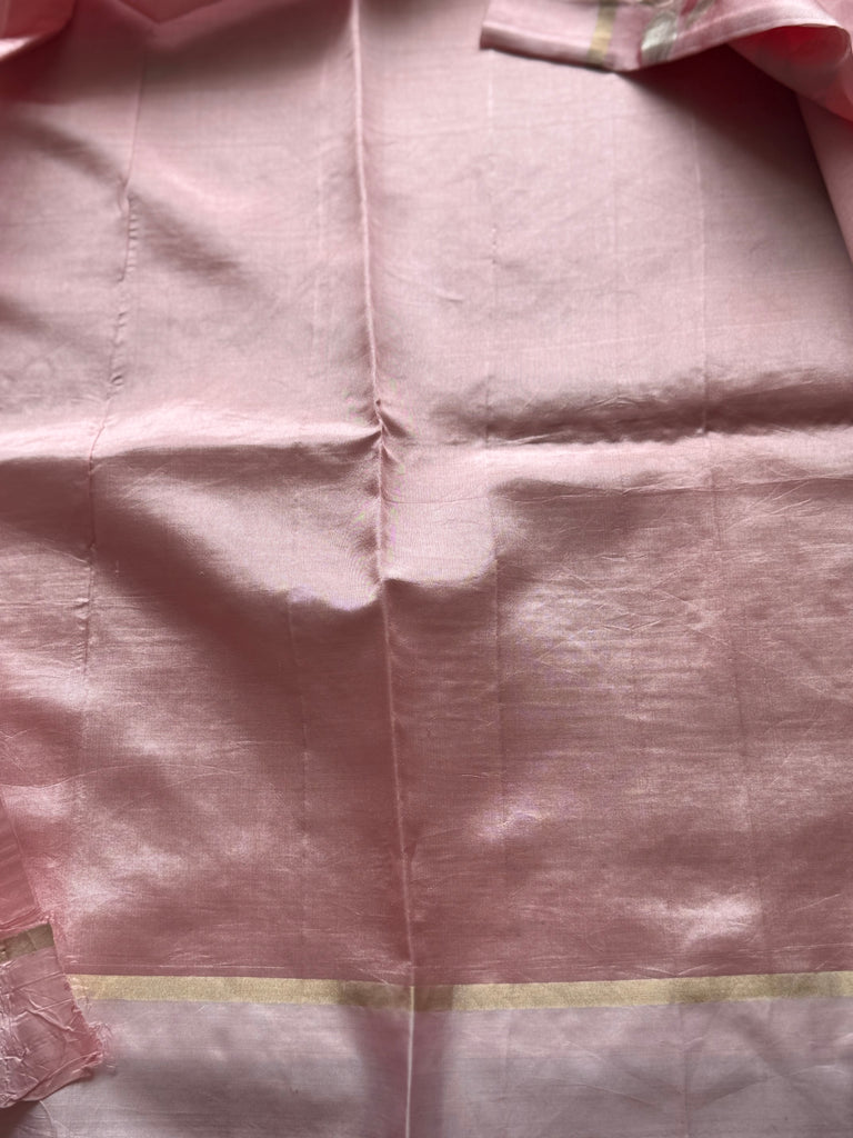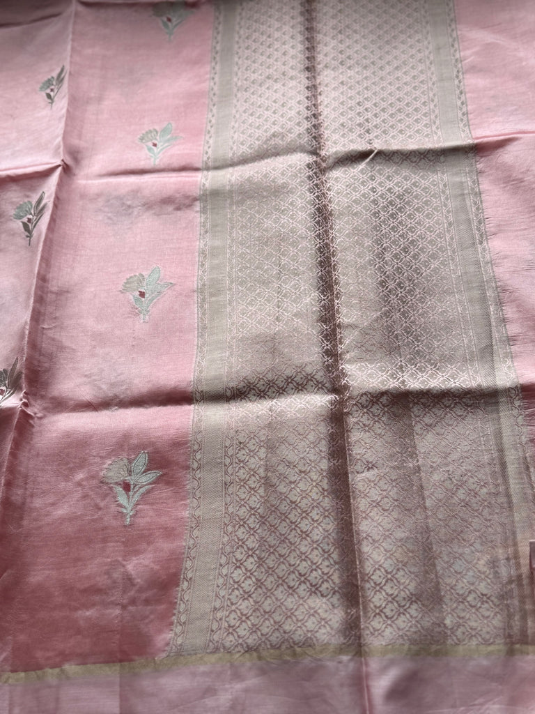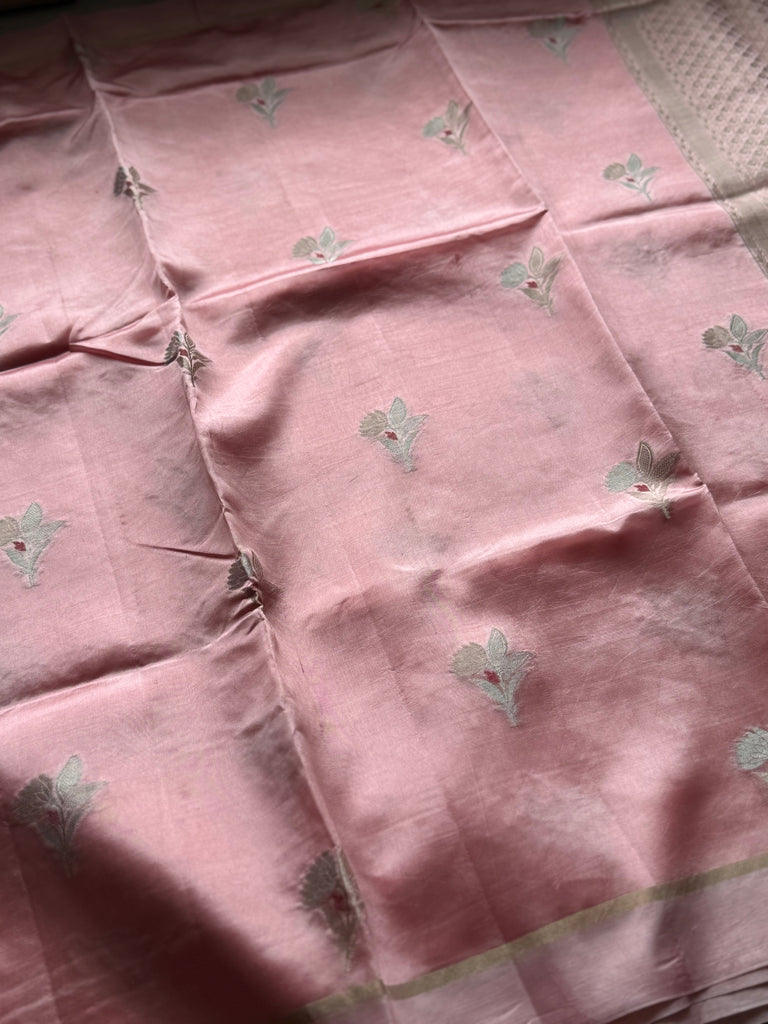 Elevate your ethnic style with this elegant Banarasi Raw Mango Silk Saree, a perfect blend of traditional craftsmanship and understated luxury. The saree comes in pink shade , highlighted with zari buttas that adds a soft, lustrous sheen and the pallu is richly adorned with zari weaves.The lightweight raw mango silk fabric drapes beautifully, making it both comfortable and graceful for long wear.