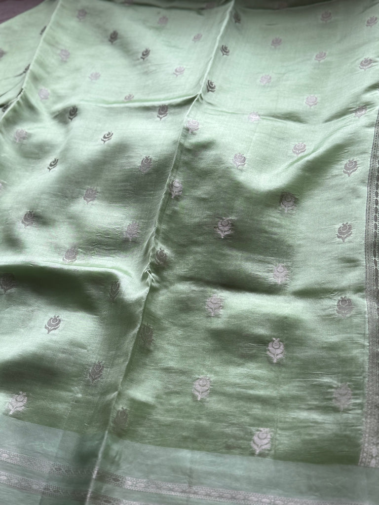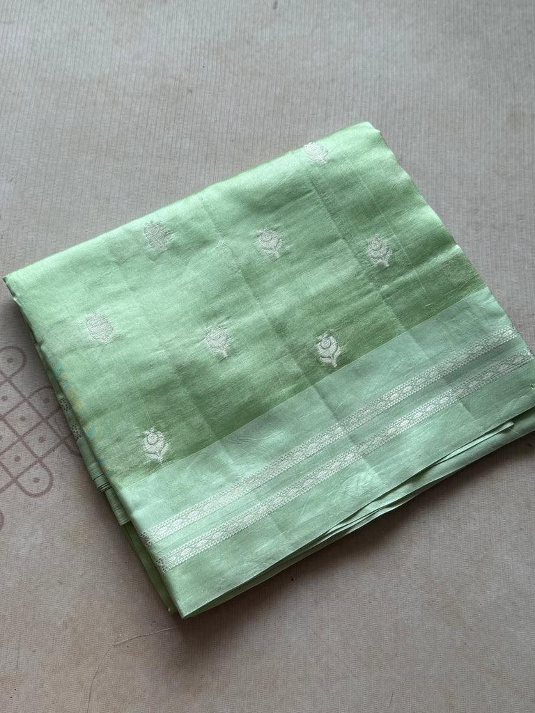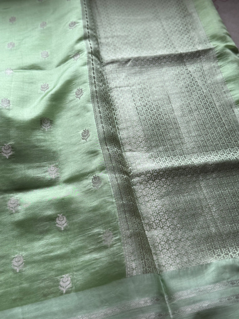 Elevate your ethnic style with this elegant Banarasi Raw Mango Silk Saree, a perfect blend of traditional craftsmanship and understated luxury. The saree comes in green shade , highlighted with silver zari buttas that adds a soft, lustrous sheen and the pallu is richly adorned with zari weaves.The lightweight raw mango silk fabric drapes beautifully, making it both comfortable and graceful for long wear.