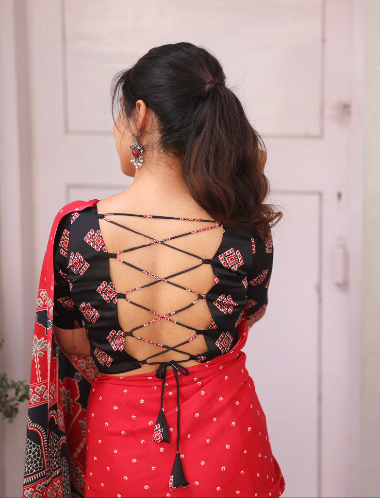 Celebrate the beauty of Indian handcrafts with this Modal Saree featuring all-over Bandhini buttas, a traditional Ajrakh pallu, and a matching Ajrakh blouse, curated by Studio Virupa.