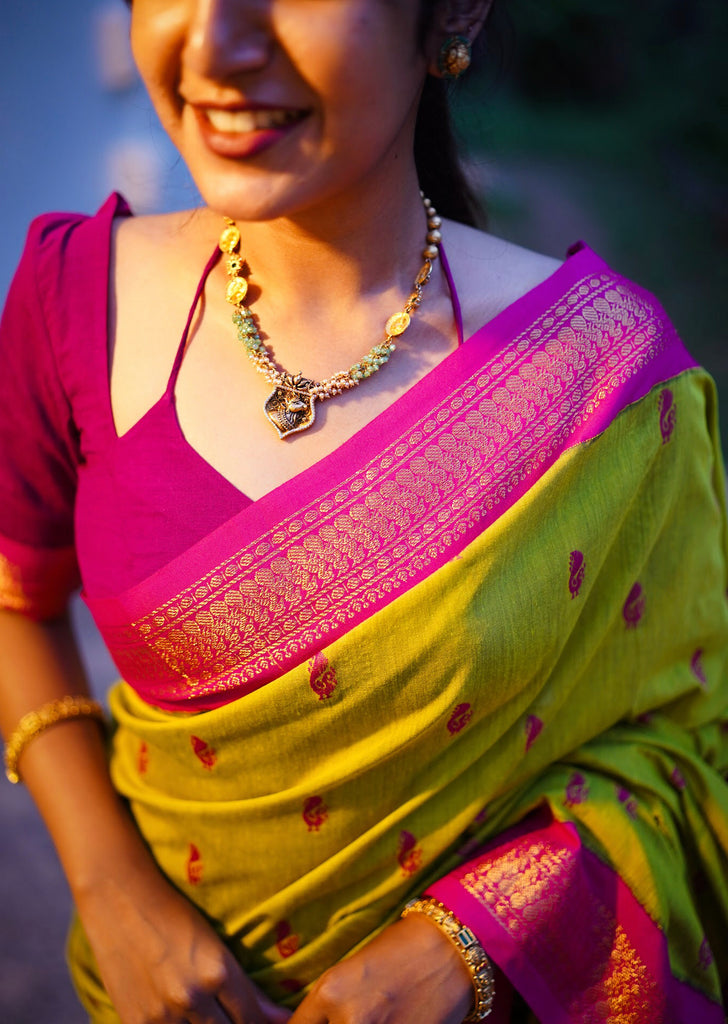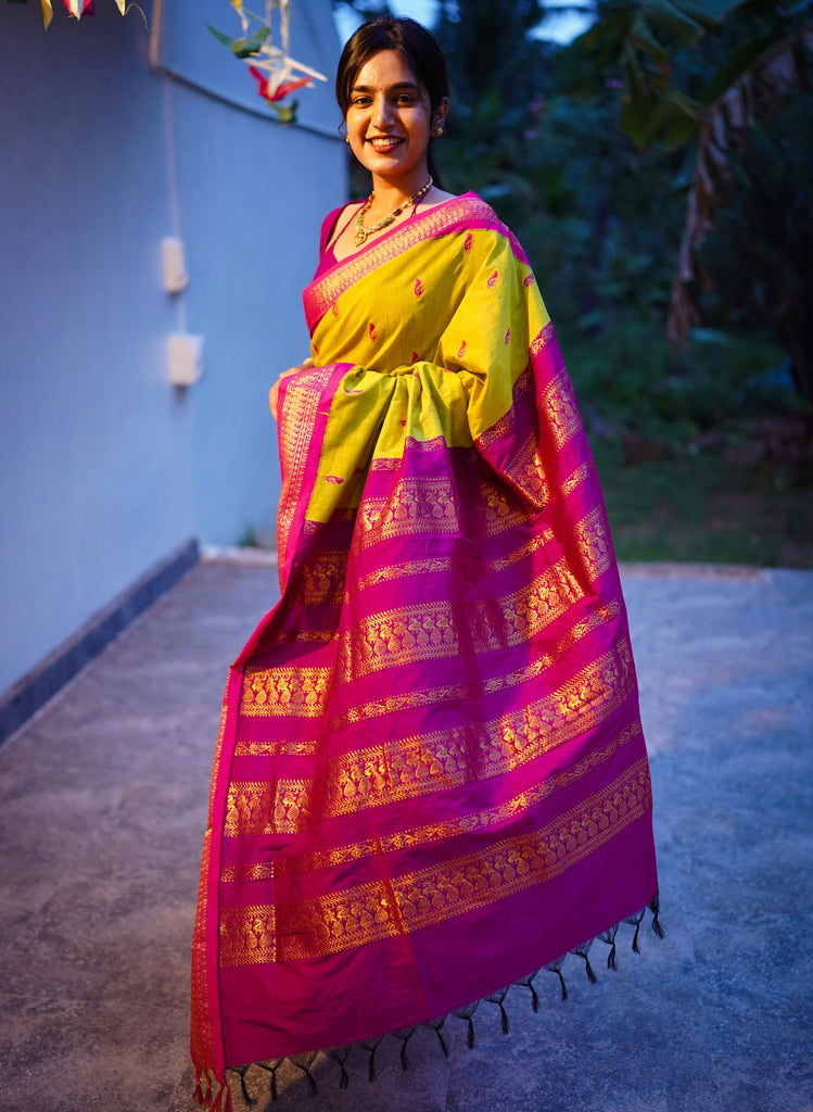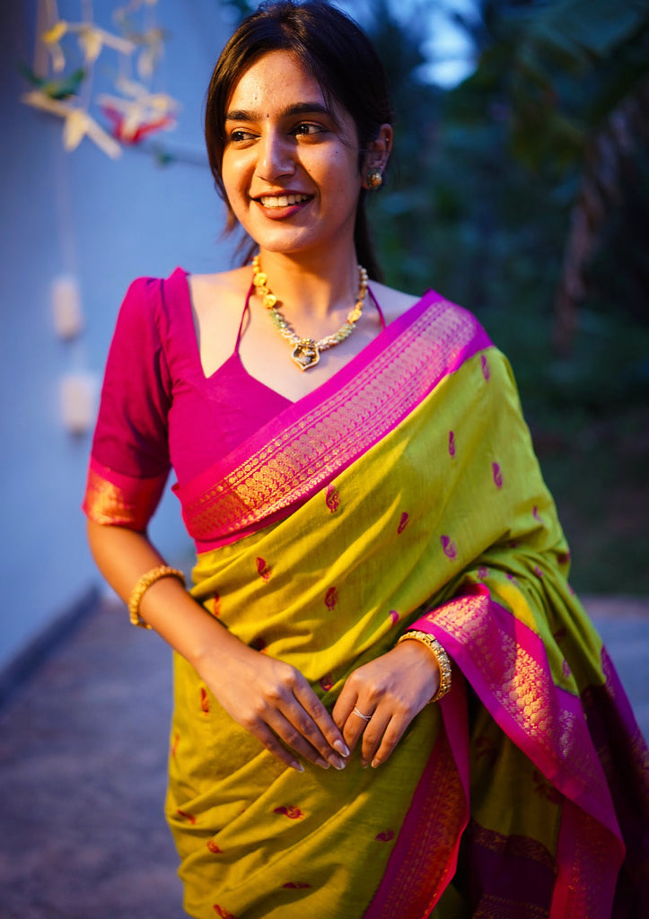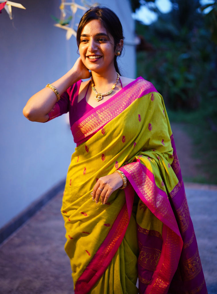 Introducing Aakriti - a luxurious semi-silk cotton saree that exudes elegance and sophistication. The vibrant Green with Rani Pink blend is beautifully complemented by a gold zari detailed border and pallu. With the coordinating blouse fabric included, you'll have a complete and timeless look for any occasion.Buttas and border is not constraint.