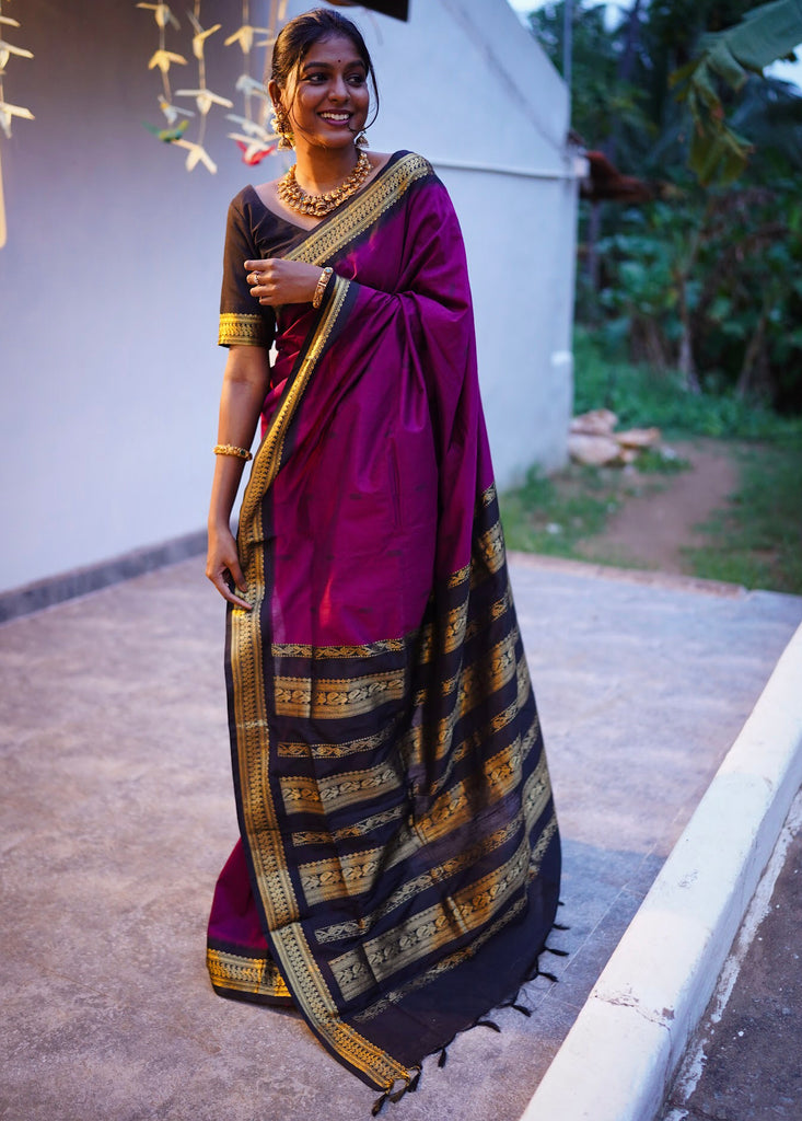 Introducing Aakriti - a luxurious semi-silk cotton saree that exudes elegance and sophistication. The vibrant Hot Pink with Black blend is beautifully complemented by a gold zari detailed border and pallu. With the coordinating blouse fabric included, you'll have a complete and timeless look for any occasion.Buttas and border is not constraint.