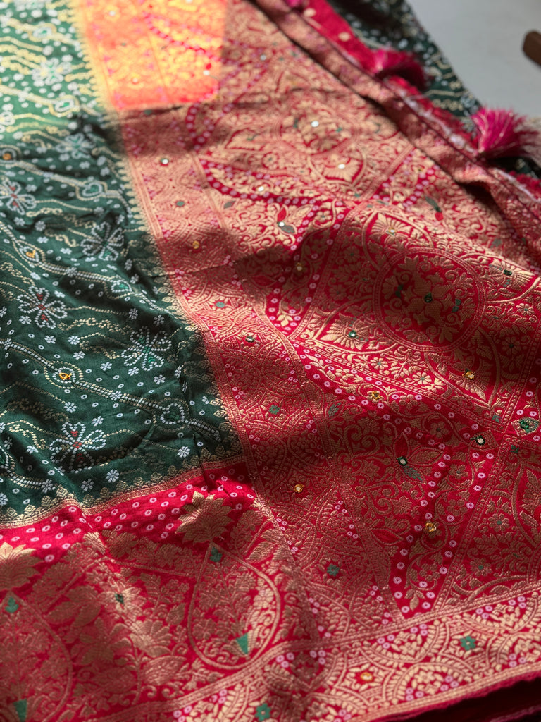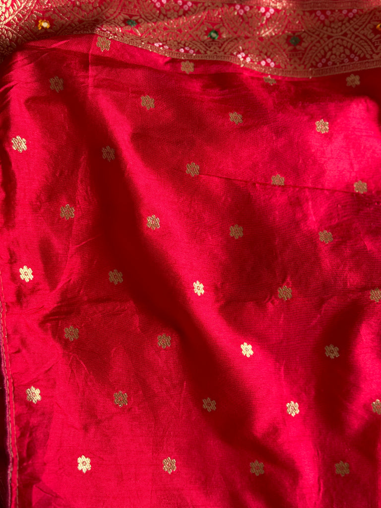 Discover the exquisite beauty of Vibha, a Banarasi silk saree adorned with bandhini inspired weaves. Crafted with care and precision, this saree exudes luxury and elegance. Elevate your style with Vibha and immerse yourself in the world of art and fashion.