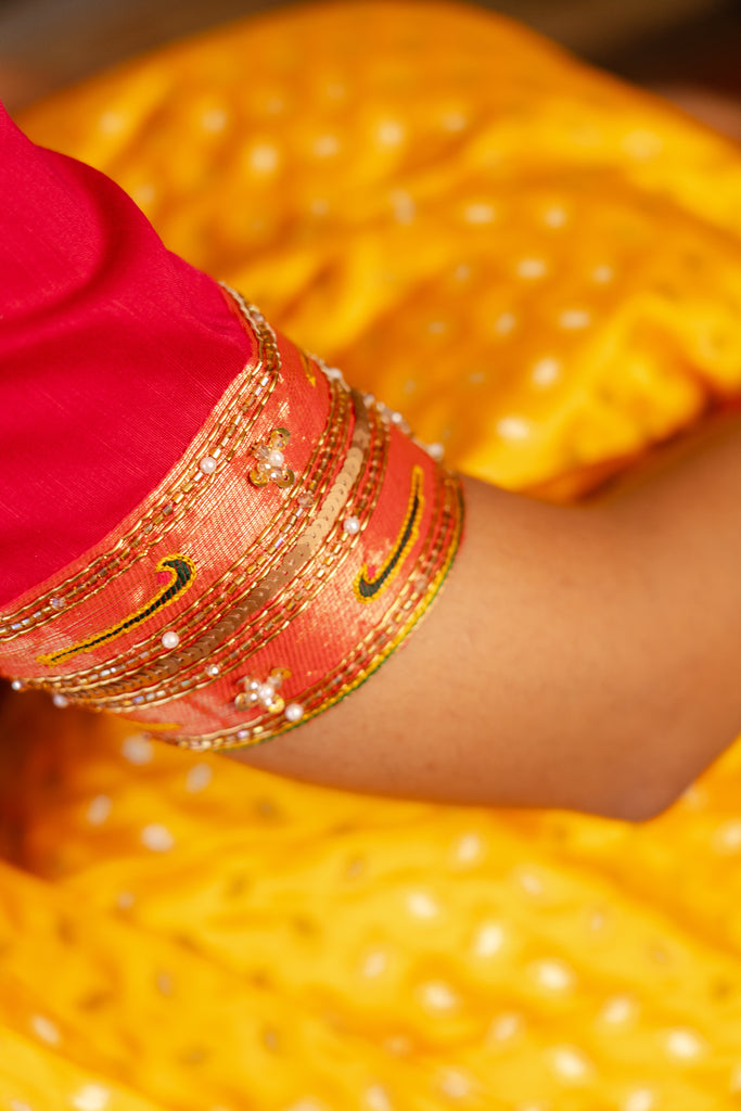 Paired with a luxurious pleated Banarasi fabric skirt in a vibrant yellow shade, the ensemble radiates vibrance and sophistication. The lightweight yet richly textured fabrics ensure both elegance and comfort, perfect for festive gatherings, family celebrations, weddings, and special cultural events across India.