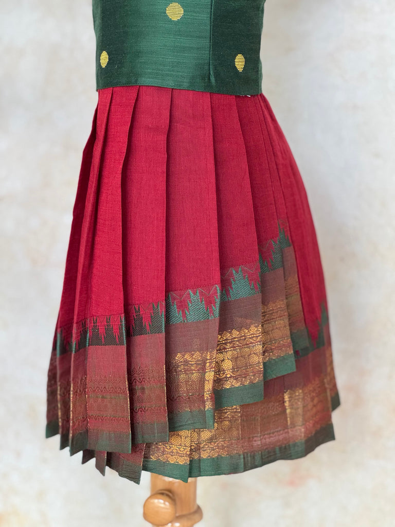 This charming Chettinad cotton skirt and top set blends tradition with elegance. The top is crafted from raw silk, featuring zari polka and cap sleeves for a graceful, festive look.