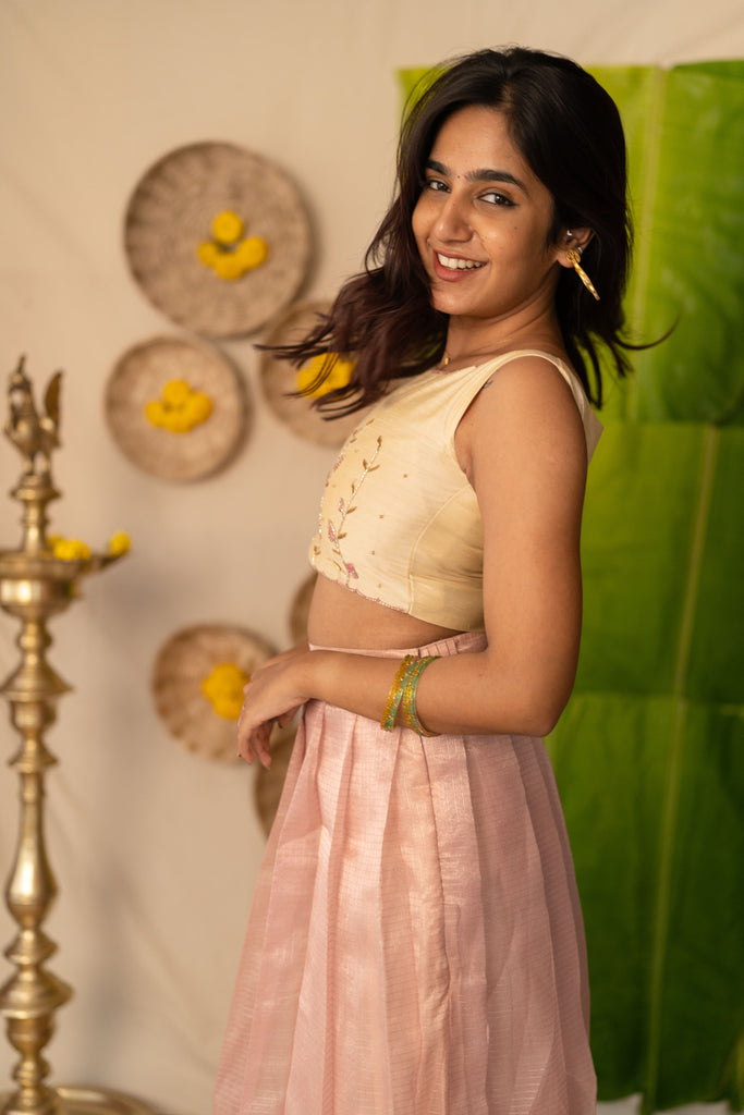 The Ciranya Crop Top & Skirt Set is thoughtfully designed for those who appreciate refined craftsmanship and timeless silhouettes. The crop top is crafted from rich raw silk, adorned with delicate hand-done aari embroidery, lending texture, depth, and artisanal charm to the piece.