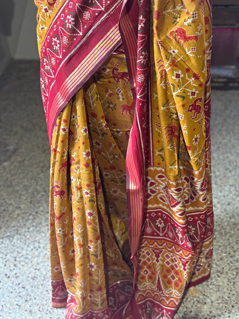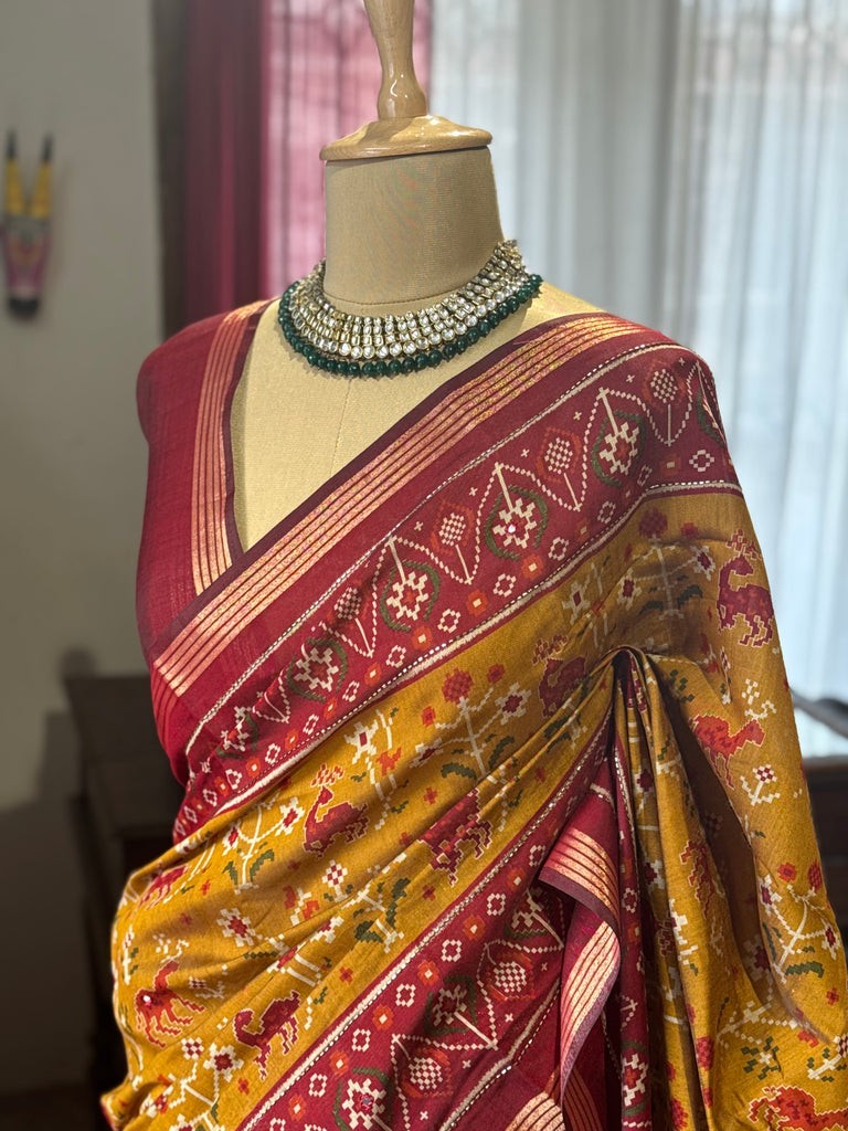 The saree features intricate Patola-inspired motifs woven across the body, showcasing classic geometric and figurative elements that reflect heritage artistry. The deep maroon contrast border, enhanced with subtle zari stripes and traditional detailing, adds depth and definition to the vibrant mustard base.