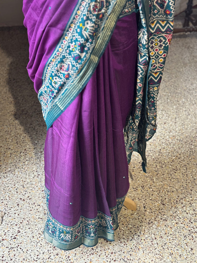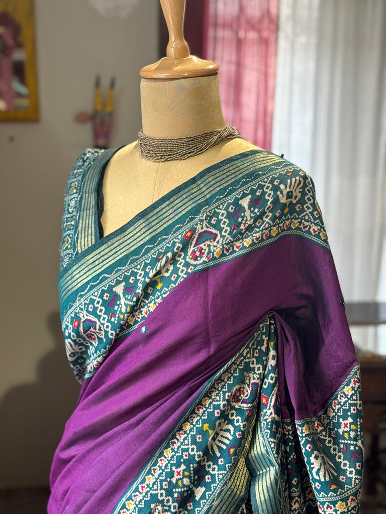 The rich purple body creates a striking contrast against the intricately woven Patola border in teal tones. Detailed with traditional motifs and fine geometric patterns, the border is gracefully extended into the pallu, creating a seamless and cohesive design flow. Subtle mirror embellishments add a hint of sparkle, catching the light and elevating the overall appeal without overpowering its elegance.