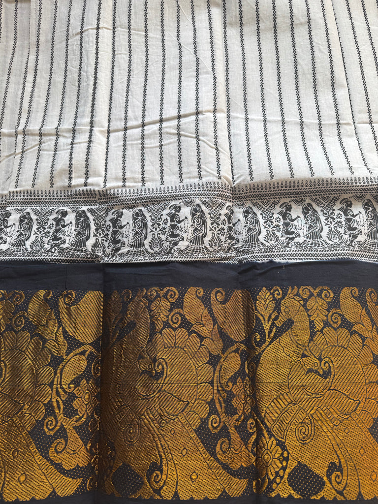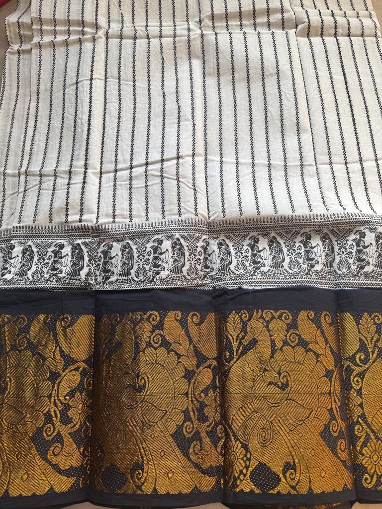 Each saree is handloom-made in Madurai, Tamil Nadu, making every piece unique and a testament to skilled artisanal craftsmanship.