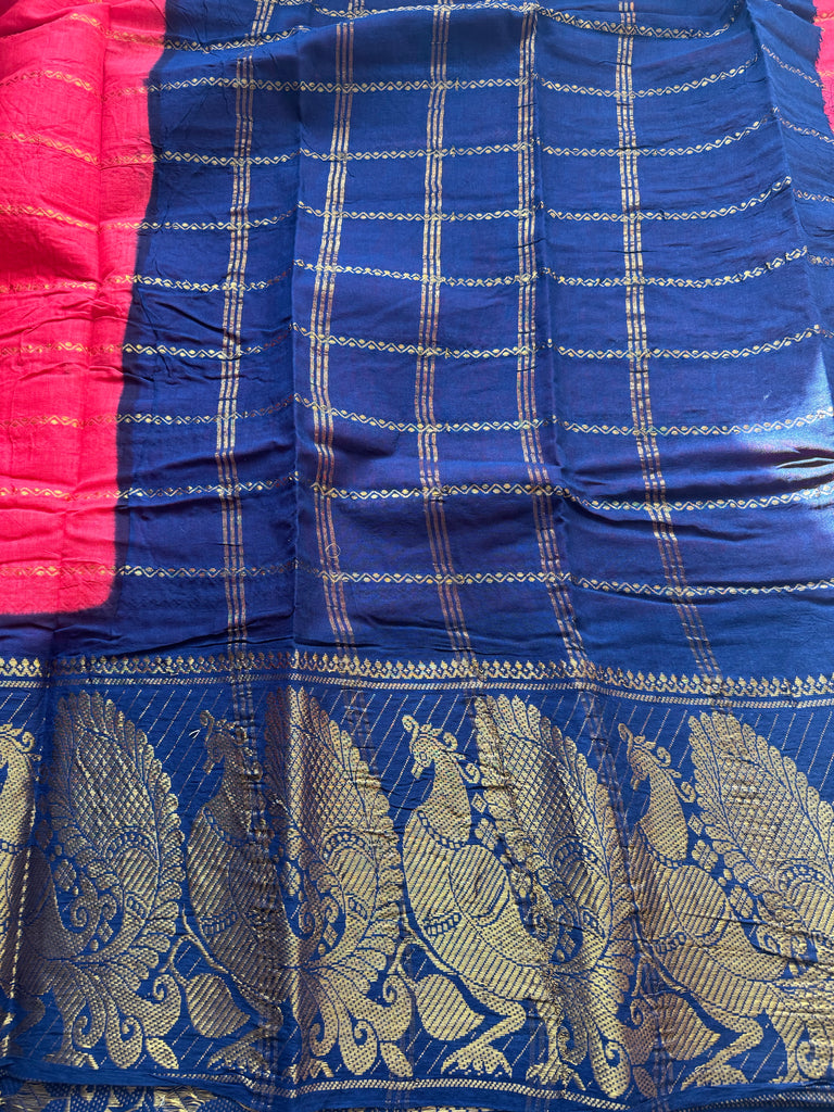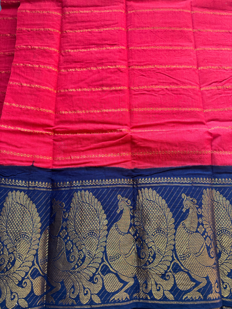 The highlight of the saree is its traditional peacock motif big border, a timeless South Indian motif symbolising tradition and cultural heritage. Lightweight and airy, this saree is perfect for long hours of wear, especially in warm climates. The pallu has beautiful contrast colour zari woven pallu.