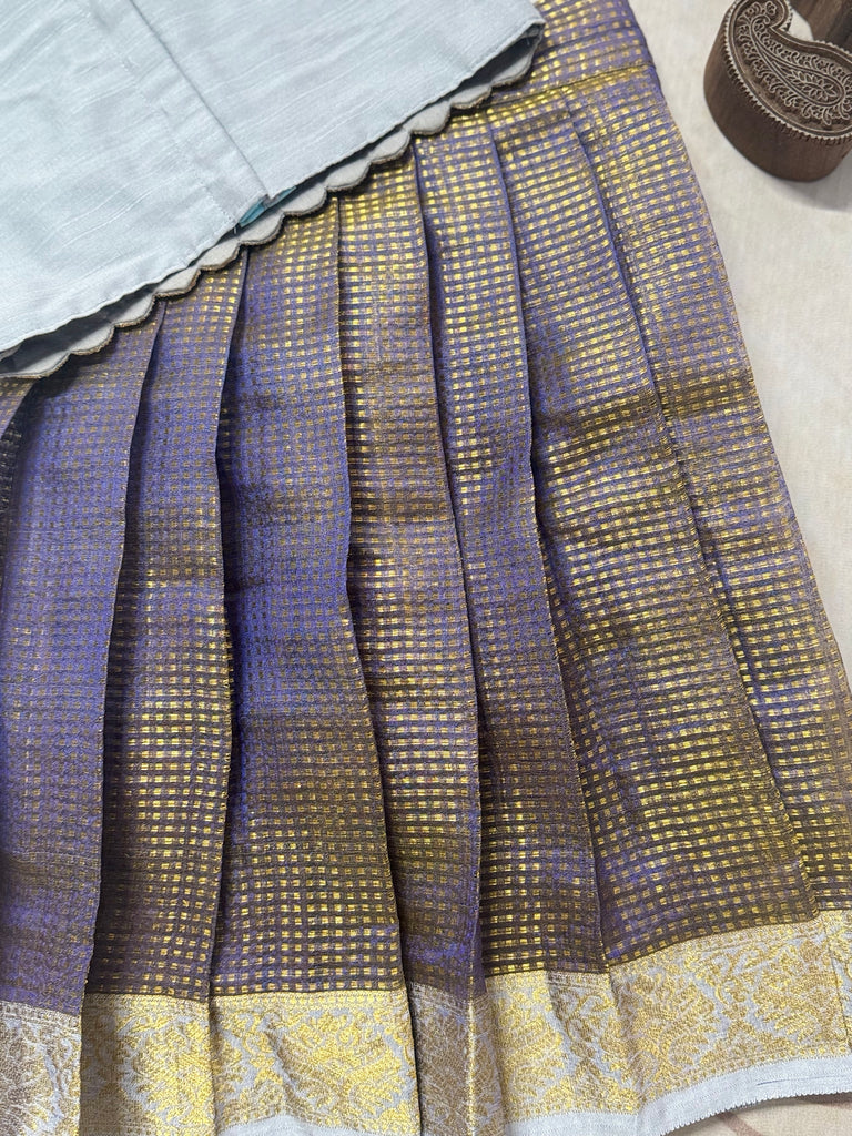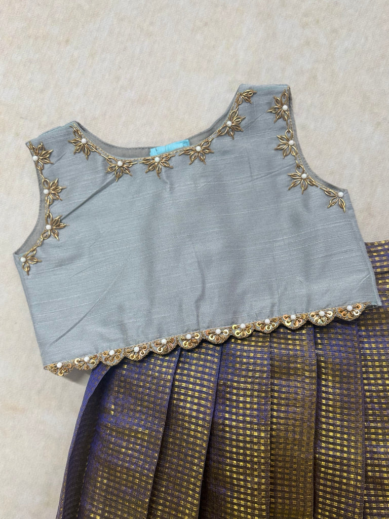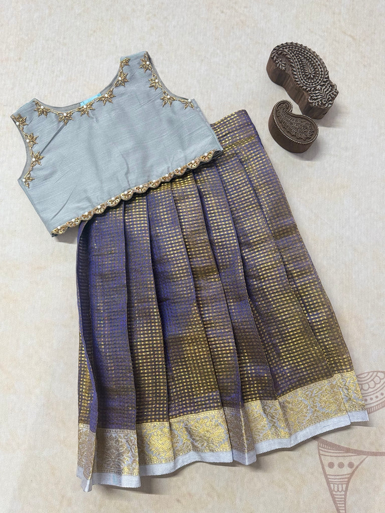 Elevate your style with our Festive Styles crop top and skirt set. Made from luxurious glass tissue silk fabric, the sleeveless top features stunning aari work for a touch of elegance. Perfect for any occasion, you'll love the comfort and beauty of this unique ensemble.