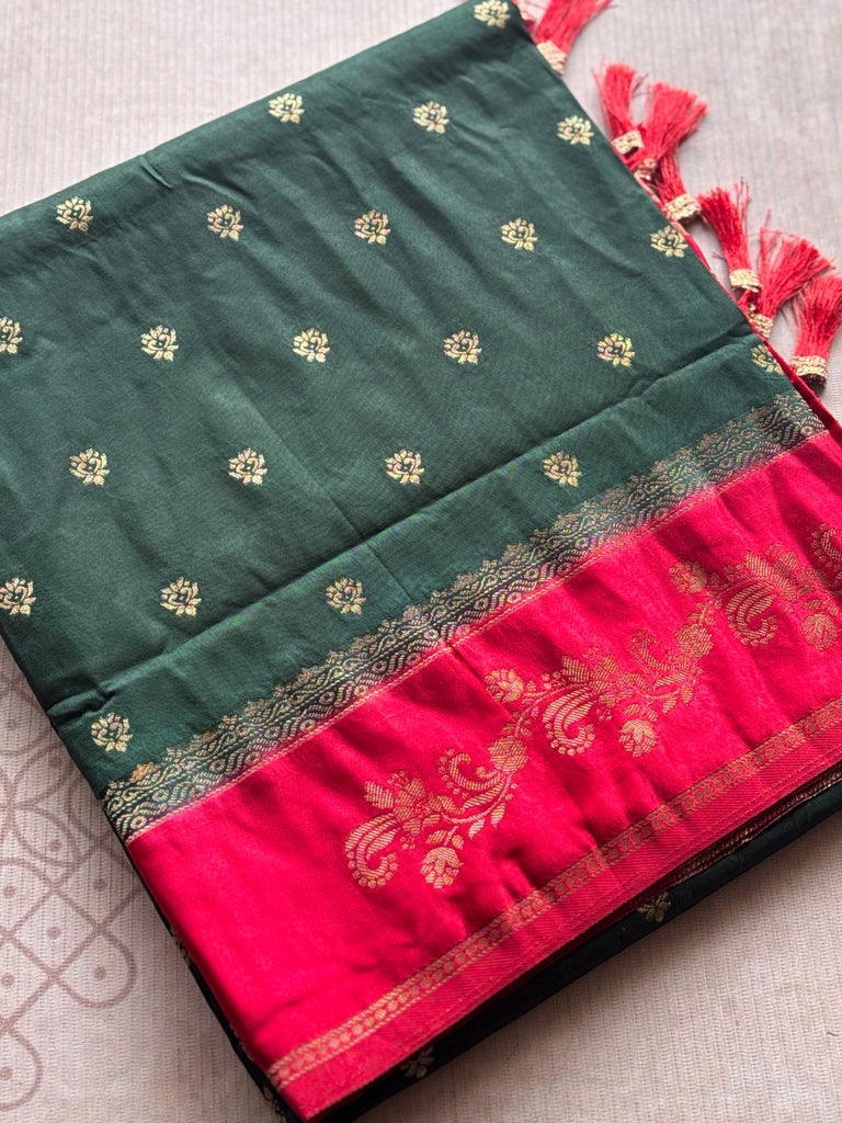 Celebrate timeless elegance with this stunning Banarasi Saree crafted in a soothing Green body paired with a regal contrast red border and pallu. The saree features delicate zari woven buttas all over the body, creating a graceful shimmer that enhances its traditional appeal.