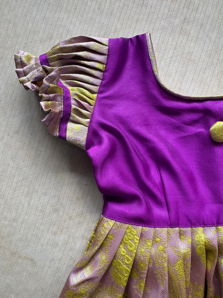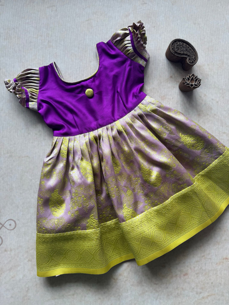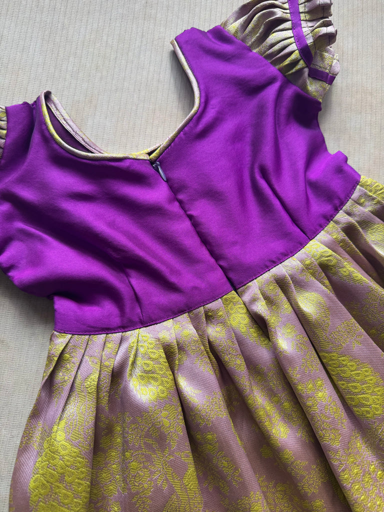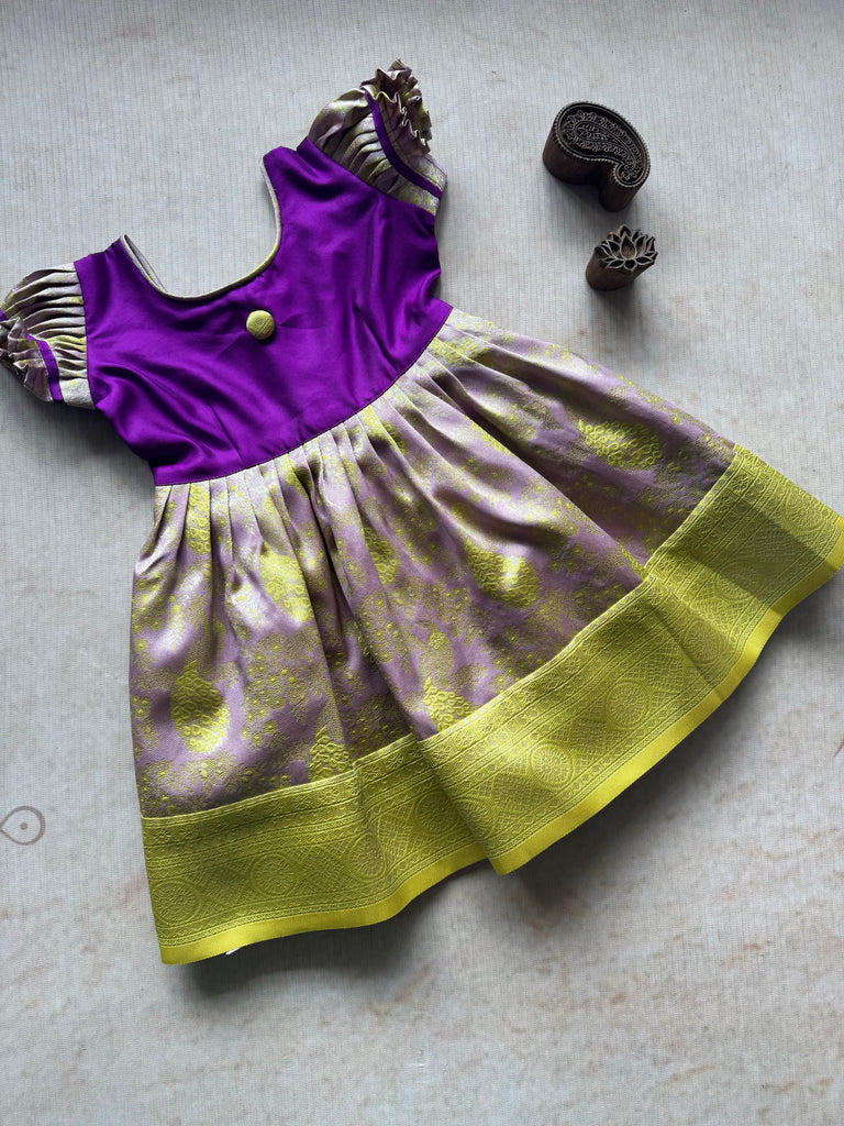 A beautiful checked Chettinad Cotton kids frock  in purple and white with  zari detailed Border.