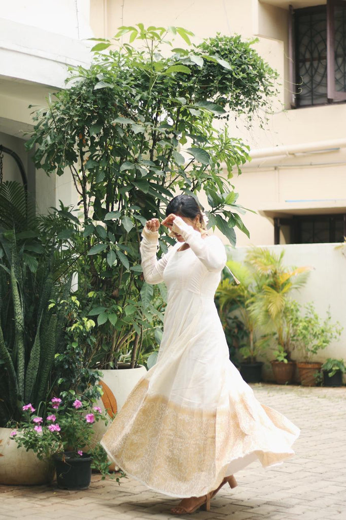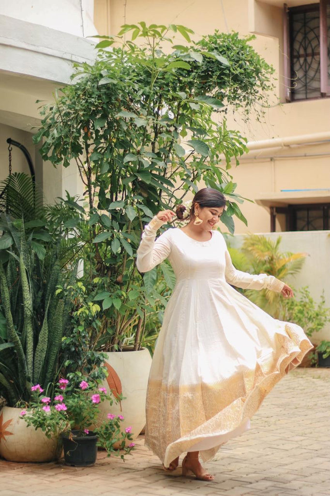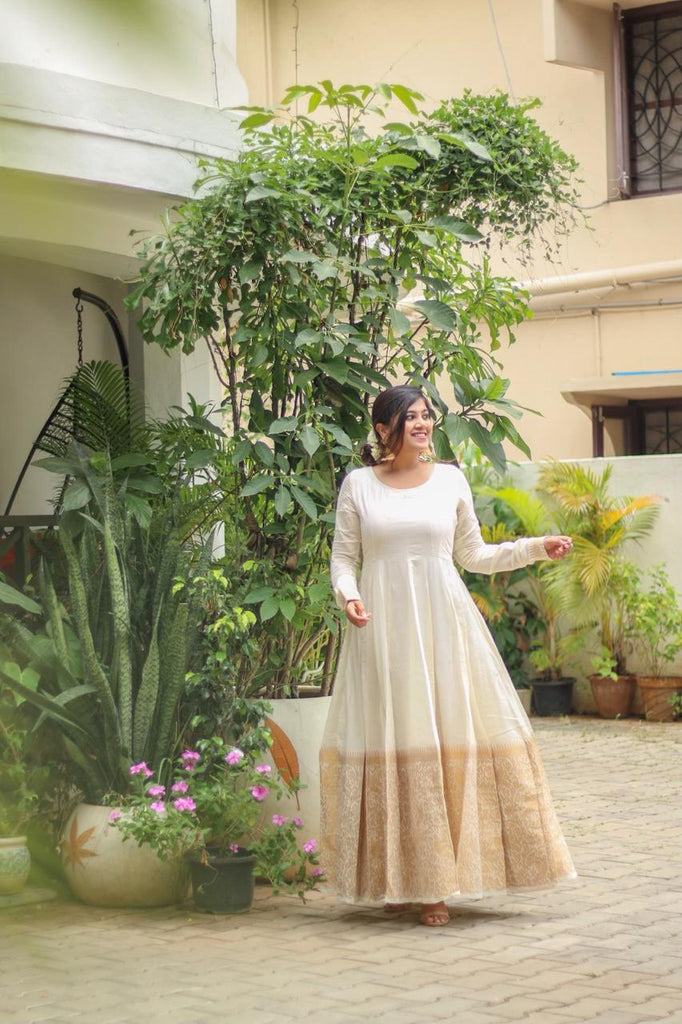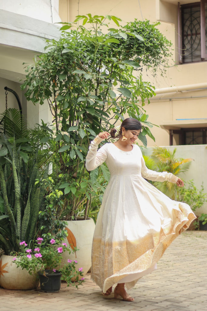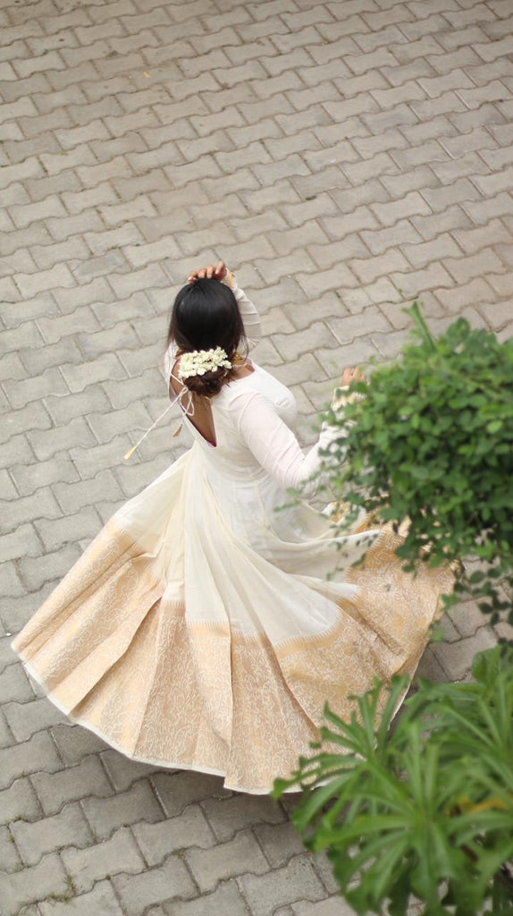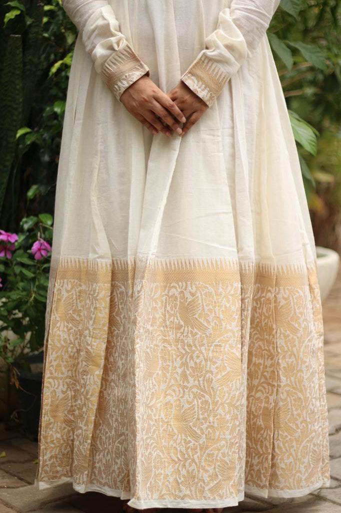 Ever classic combination of Half white & Gold Long Dress with golden Parrot & forest design filled with Zari & etched with our famous Korvai Border giving you the elegant look you need!!