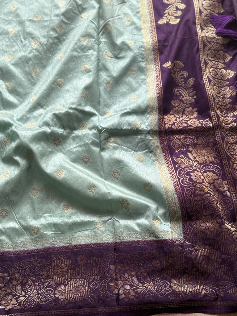 Celebrate timeless elegance with this stunning Banarasi Saree crafted in a soothing light blue body paired with a regal royal purple contrast border and pallu. The saree features delicate zari woven buttas all over the body, creating a graceful shimmer that enhances its traditional appeal.