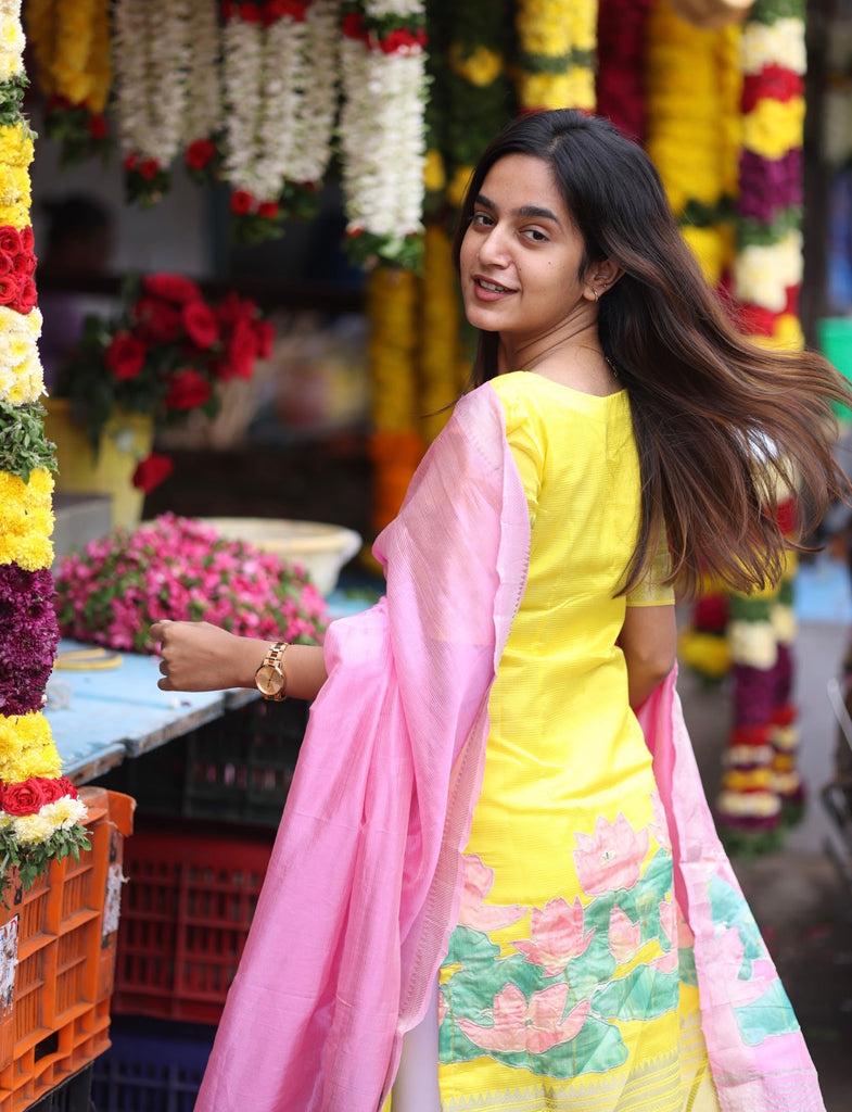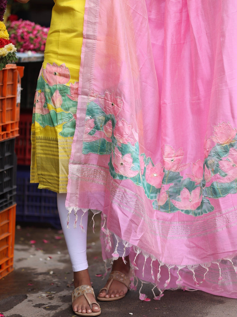 This Mangalgiri silk kurta is skillfully made with applique detailing and paired with a matching dupatta, adding a touch of elegance to your ensemble.