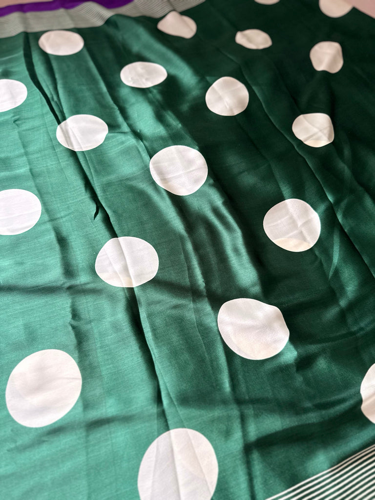 The body features striking oversized white polka dots set against a soft base, giving the saree a modern, retro-inspired charm. This clean and minimal body design is balanced with a sleek striped border in green and white, adding that little touch of structure to the flowy drape.