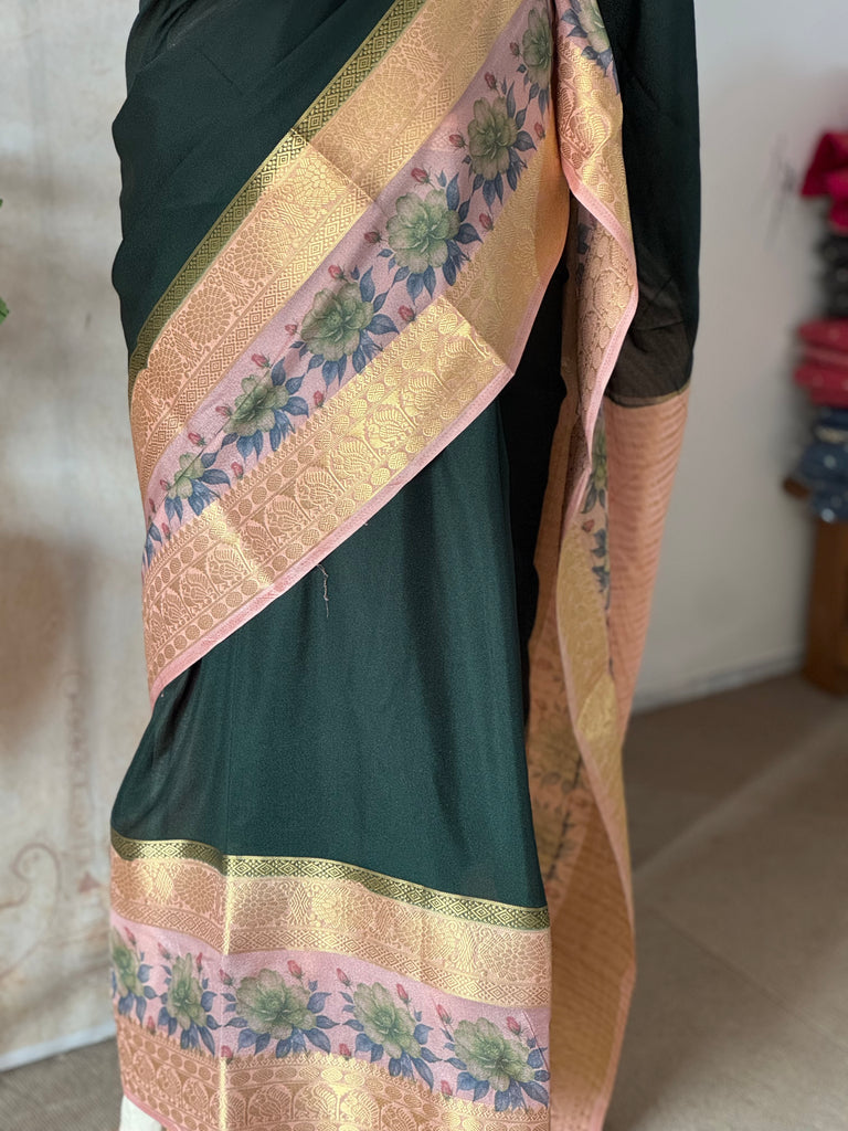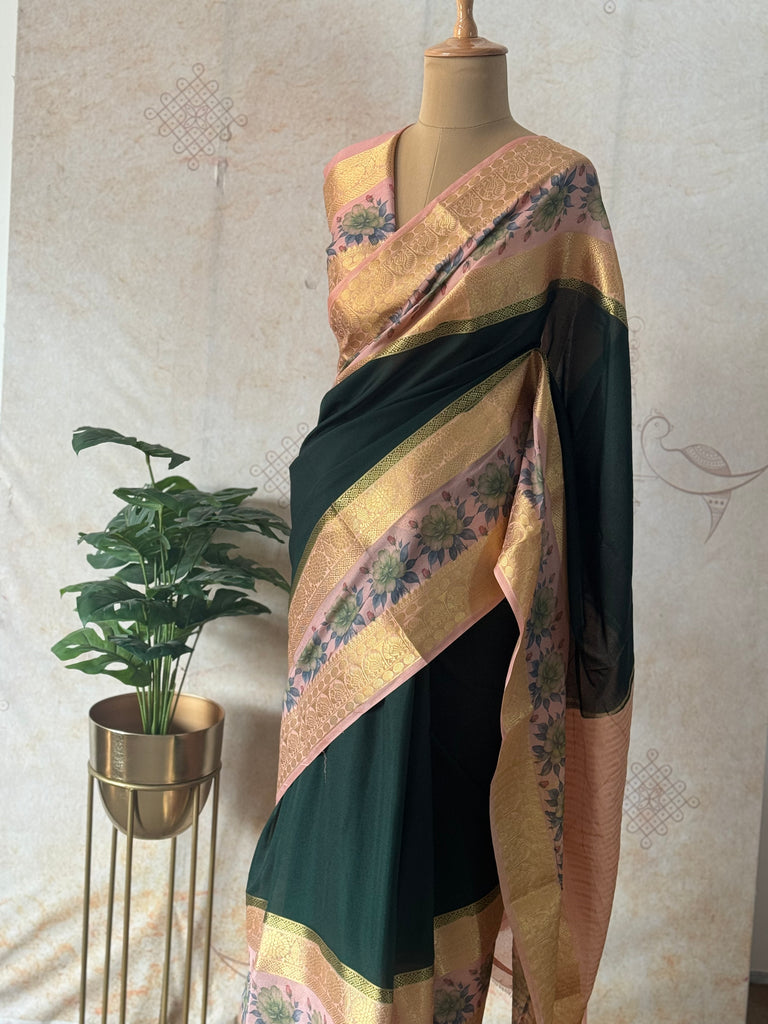 Tags: Mysore Crepe Silk, Mubbagam Saree, Floral Border Saree, Zari Detailing, Plain Body Saree, Elegant Silk Saree, Lightweight Silk Saree, South Indian Saree
