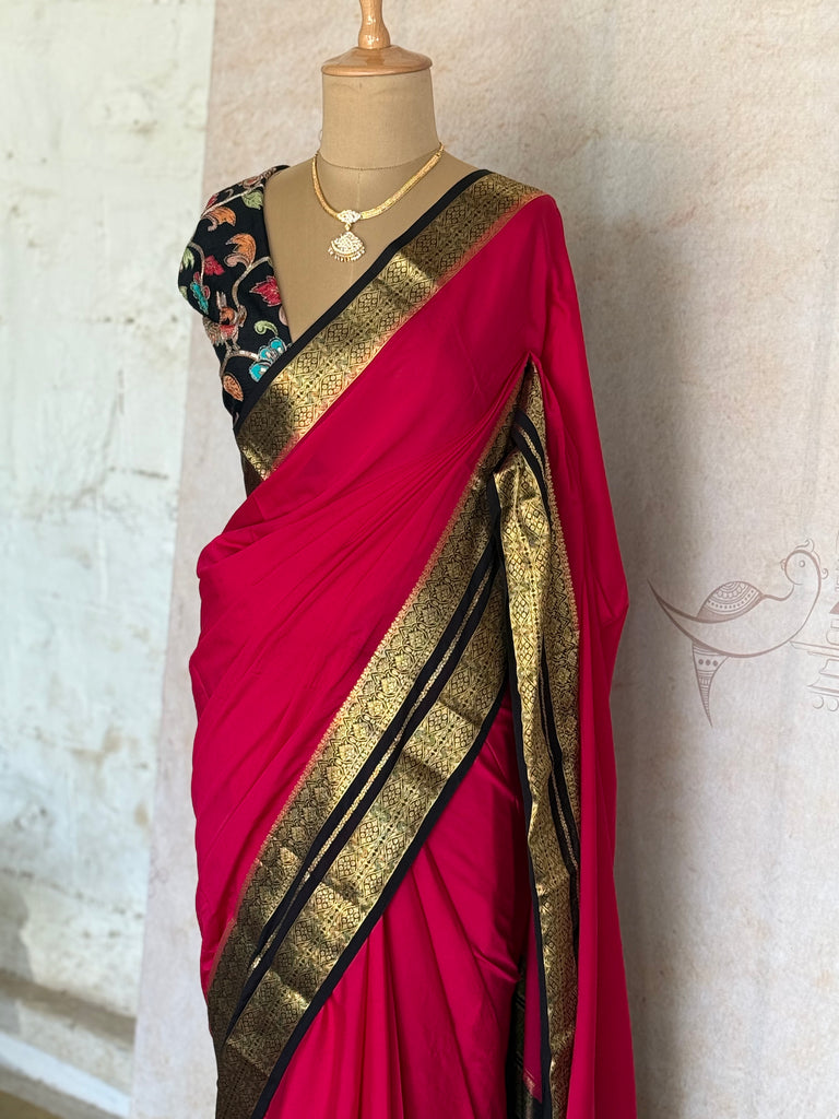 The saree, crafted in smooth and lightweight semi crepe silk, drapes effortlessly and offers a flattering silhouette. Its vibrant hue is elevated by a lustrous zari-woven border in classic gold and black, adding depth and regal charm to the look.