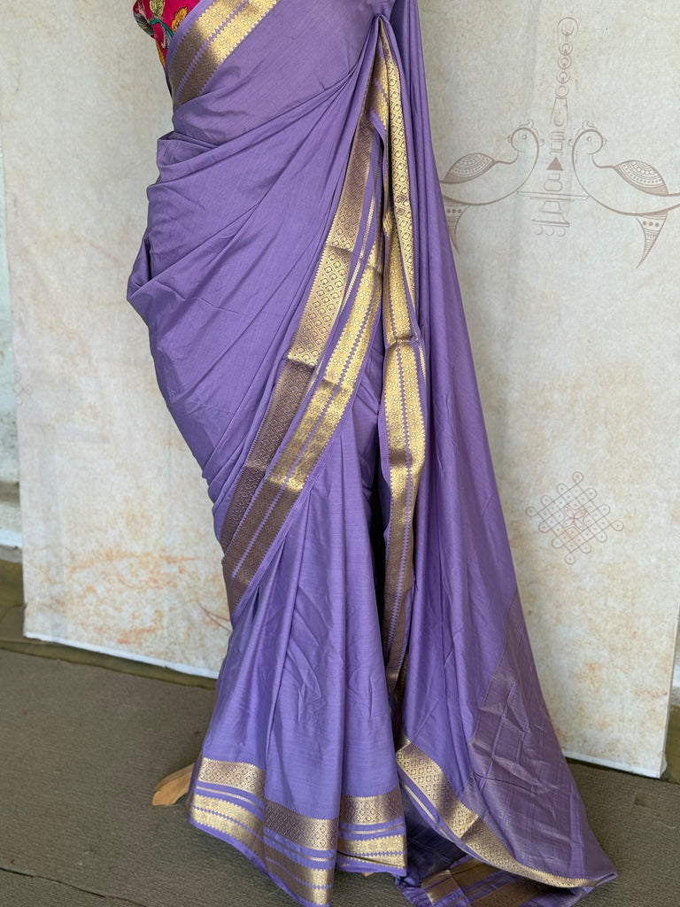 Rendered in a serene lavender hue, this saree is beautifully complemented by a classic gold zari woven border. The intricate zari detailing adds a subtle sheen and traditional charm, creating a timeless contrast against the soft pastel base. Its minimal yet regal aesthetic makes it a versatile addition to any wardrobe.