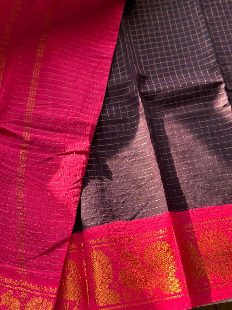Nayanam Zari Kattam is a beautifully handwoven Madurai Sungudi cotton saree in a rich navy blue color, adorned with traditional zari checkered motifs throughout the body. Meticulously crafted on artisanal handlooms, this cotton saree features a contrasting pink border and pallu that adds vibrant elegance to classic Indian wear.
