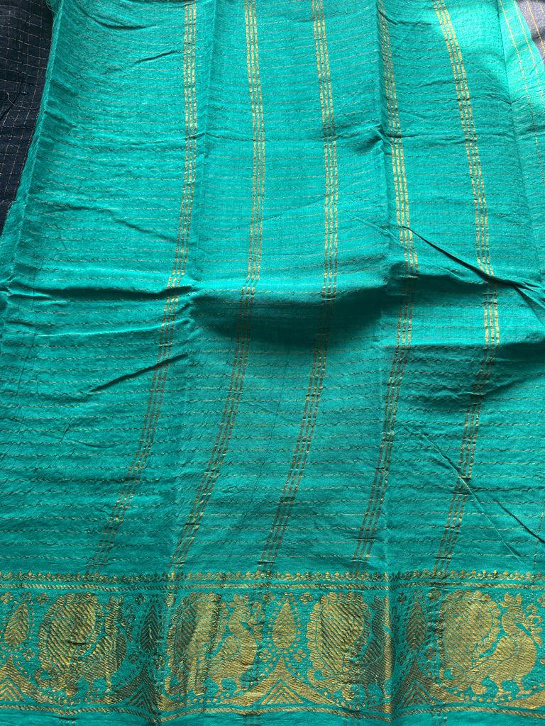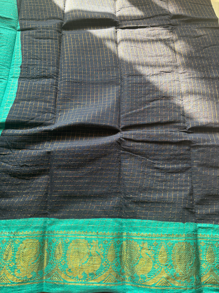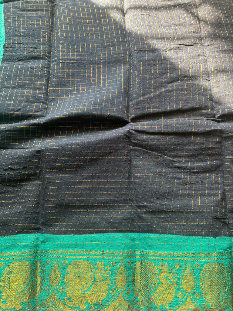 Nayanam Zari Kattam is a beautifully handwoven Madurai Sungudi cotton saree in a rich navy color, adorned with traditional zari checkered lines throughout the body. Meticulously crafted on artisanal handlooms, this cotton saree features a contrasting aqua blue border and pallu that adds vibrant elegance to classic Indian wear.