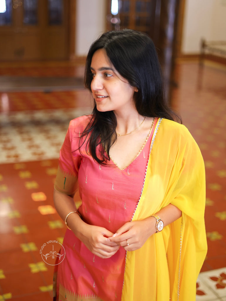 This Paithani set features a beautiful peach kurta paired with a vibrant yellow dupatta and pants for a stunning contrast look. Made with high-quality materials, this set offers both style and comfort to elevate your wardrobe. Perfect for any occasion, this set is a must-have for those looking for a modern twist on traditional Indian fashion.