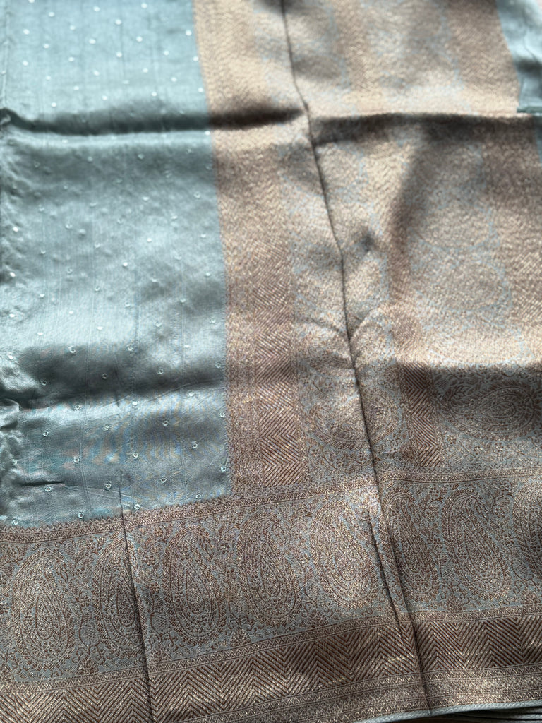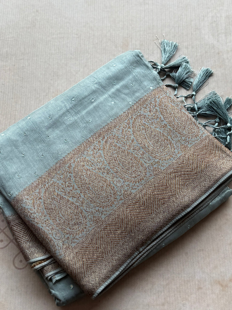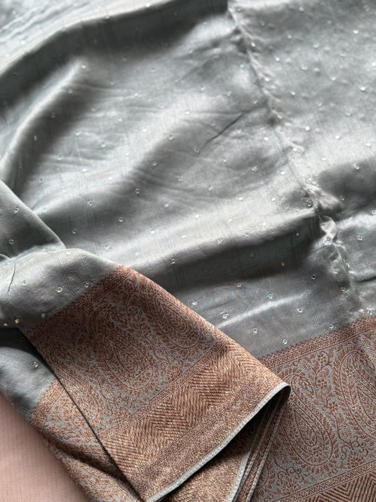 Woven from rich dupion silk, this fabric carries a natural textured sheen that reflects understated luxury. The soft, muted tone enhances its timeless appeal, while delicate mirror embellishments add a subtle sparkle, catching the light with every movement. The highlight of the piece is its opulent antique zari border, featuring finely woven traditional motifs and intricate patterns that lend a regal, heirloom charm.