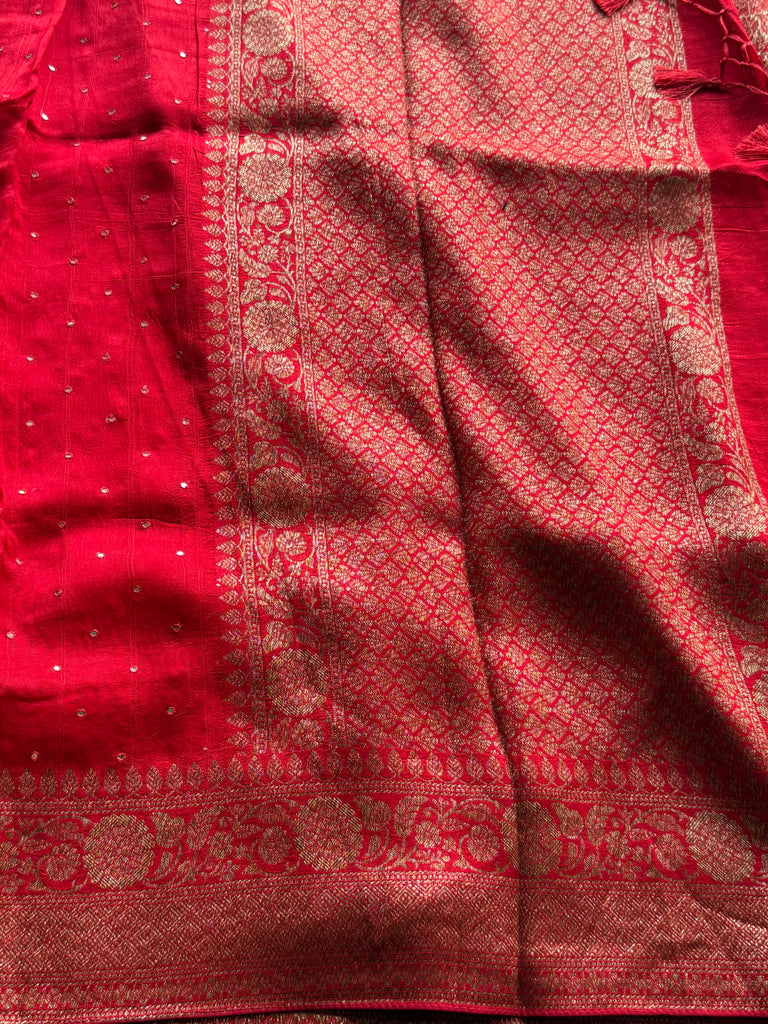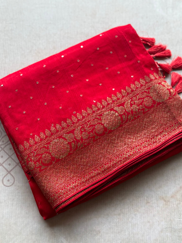 Woven from rich dupion silk, this fabric carries a natural textured sheen that reflects understated luxury. The soft, muted tone enhances its timeless appeal, while delicate mirror embellishments add a subtle sparkle, catching the light with every movement. The highlight of the piece is its opulent antique zari border, featuring finely woven traditional motifs and intricate patterns that lend a regal, heirloom charm.