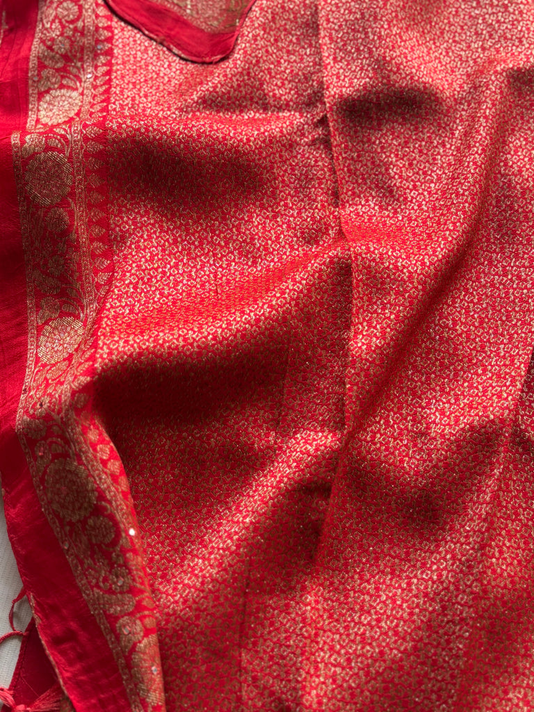 Elevate your ethnic wardrobe with this exquisite Banarasi Dupion Silk masterpiece, beautifully crafted with intricate mirror work and antique zari detailing.