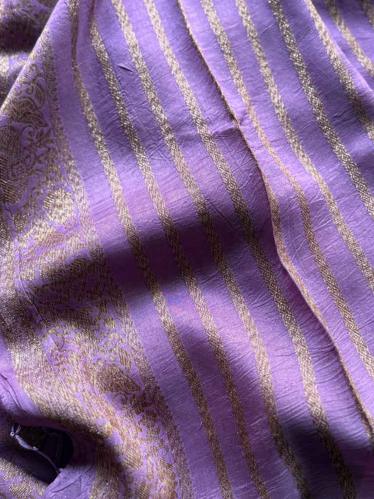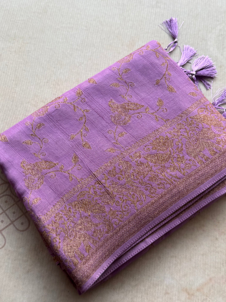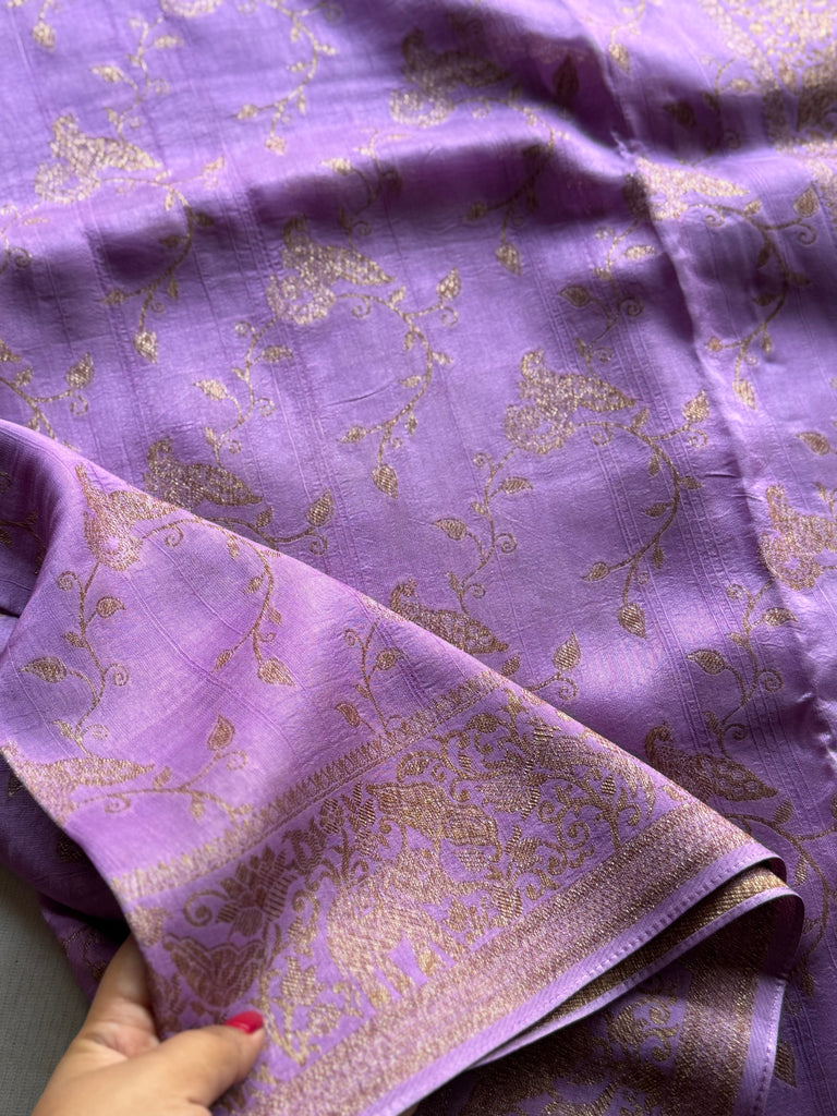 Elevate your ethnic wardrobe with this exquisite Banarasi Dupion Silk drape, crafted to embody timeless elegance and regal charm. Woven in a graceful shade of lavender, the fabric features the signature textured finish of dupion silk, lending it a rich body and subtle sheen.